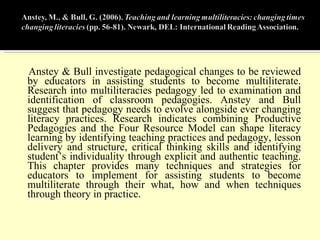 The document discusses several articles related to multiliteracies pedagogy in middle school classrooms. It addresses the need for teachers to understand students' diverse backgrounds and prior experiences with digital technologies to better support their literacy development. The articles suggest educators implement authentic literacy projects, incorporate multimodal texts, and use comprehension strategies to help students learn in today's multimedia environments.
