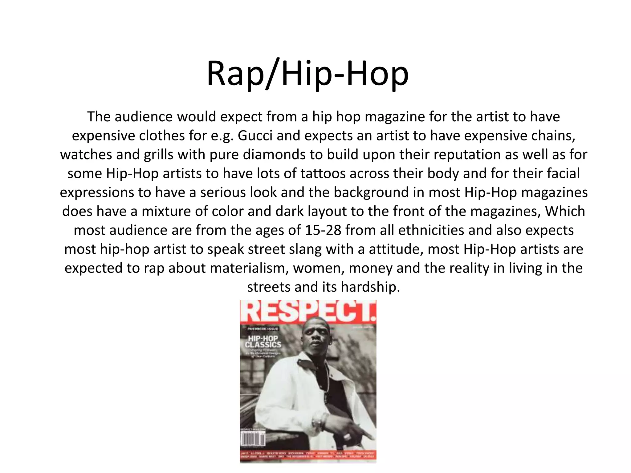 - Hip-hop artists are expected to wear expensive brands and have tattoos, serious expressions, and rap about materialism, money and street life.