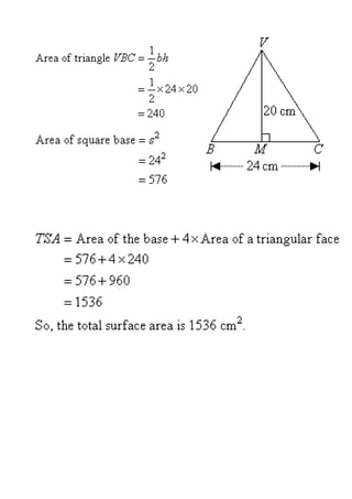 Types of pyramids include triangular, square, and pentagonal pyramids based on the shape of their base. A pyramid has triangular sides meeting at a single apex point directly above the center of its base. The surface area of a pyramid is the sum of the base area and half the perimeter multiplied by the slant height when the sides are equal triangles, or the sum of the base area and individual side areas when the sides are different shapes. The volume of any pyramid is one-third the area of the base multiplied by the height.