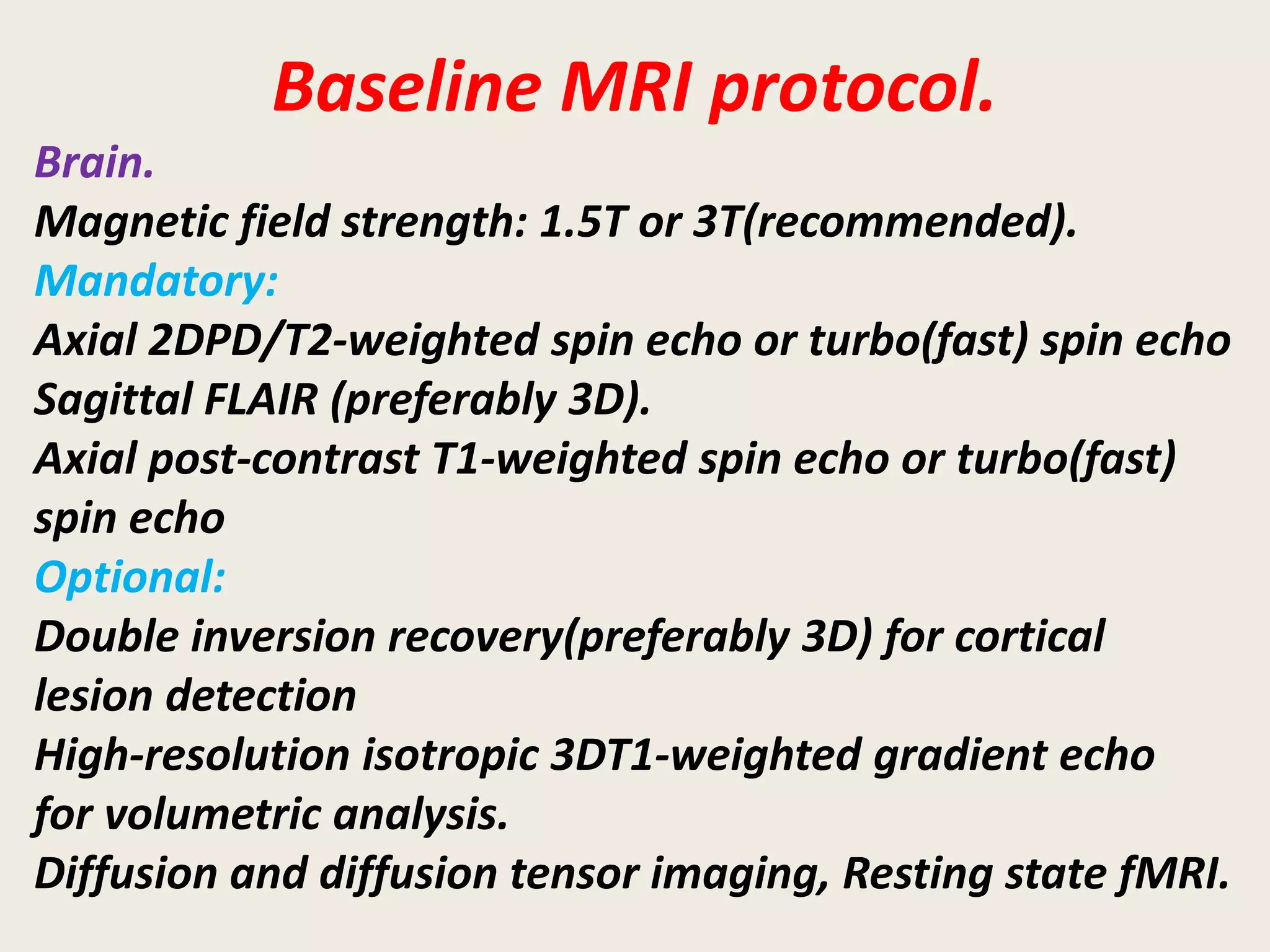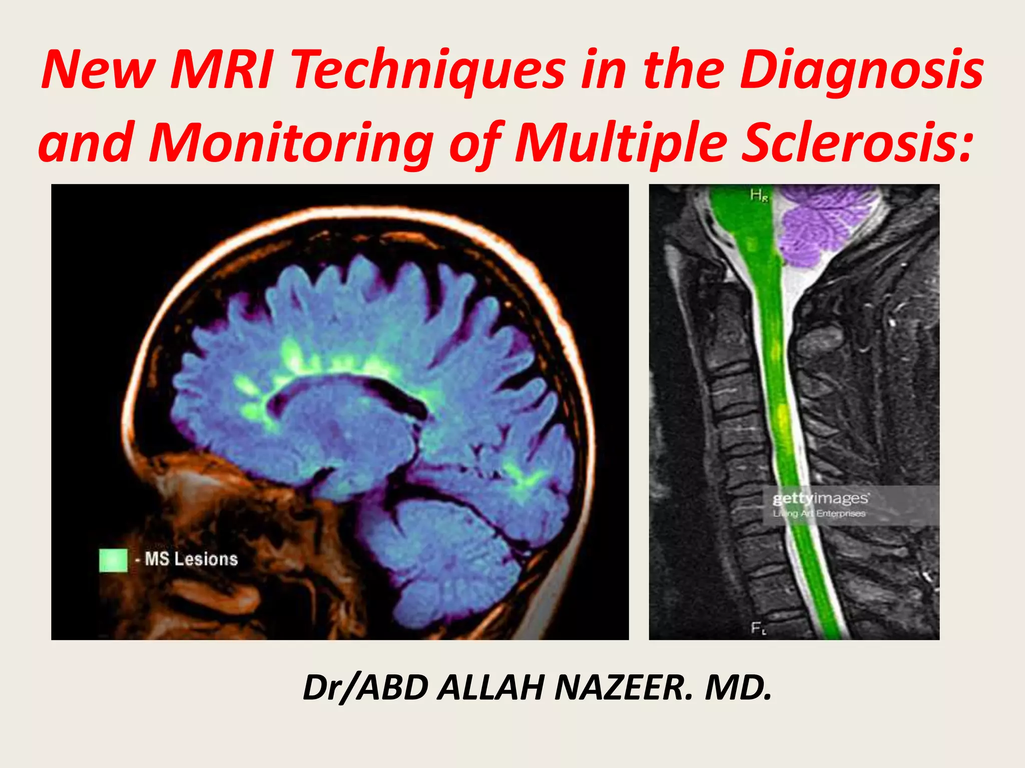 This document discusses new MRI techniques for diagnosing and monitoring multiple sclerosis (MS). It recommends protocols for baseline and follow-up brain and spinal cord MRIs, including mandatory and optional sequences. Advanced techniques like double inversion recovery, diffusion tensor imaging, and MR spectroscopy are highlighted for improving detection of gray matter lesions and diffuse white matter damage compared to conventional MRI. The document concludes that while conventional MRI is important for MS, advanced techniques provide higher sensitivity and specificity for both lesions and normal-appearing brain tissue, furthering understanding of MS pathophysiology.