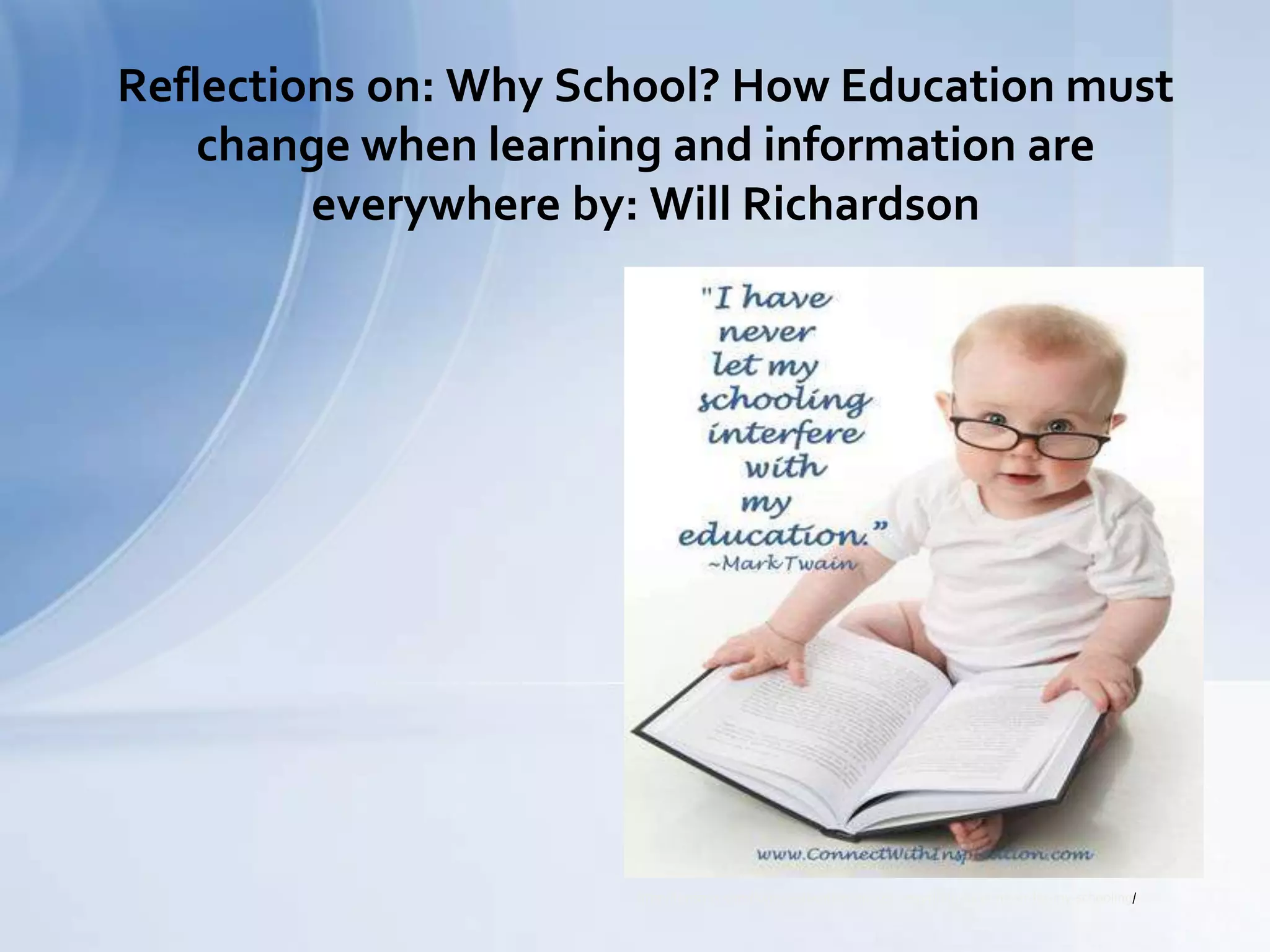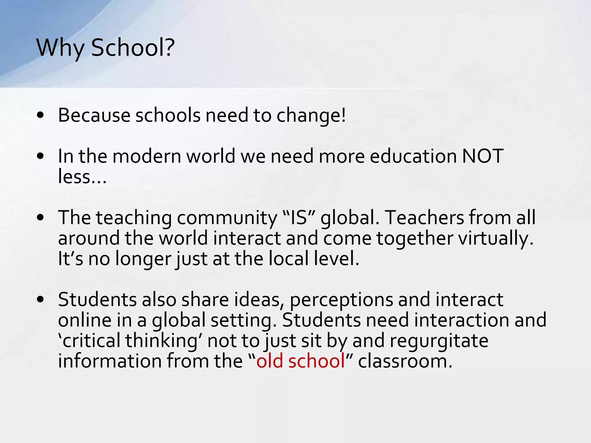 This document discusses the need for education reform to better prepare students for the modern world. It argues that schools need to move away from an "old school" approach of standardized testing and rote memorization. Teachers are encouraged to embrace new technologies, use project-based and problem-solving lessons, and focus on developing students' critical thinking skills over test scores. The document advocates for a more "progressive" approach where students have more control over their own learning and study topics that interest them. Overall, it calls for a "paradigm shift" in education with more personalized, collaborative, and real-world learning experiences to replace traditional classroom models.