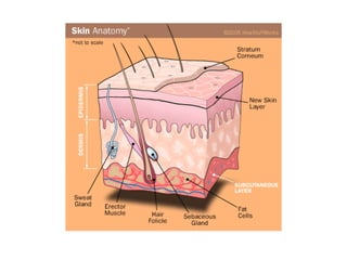 The skin is the largest organ of the integumentary system and protects the body from damage. It has three main layers - the epidermis, dermis, and hypodermis. The epidermis is the outermost layer and provides a protective barrier. It contains melanocytes that produce melanin and give skin its color. The dermis lies below the epidermis and contains connective tissue, nerves, and blood vessels. The deepest layer is the hypodermis, which contains fat and connects the skin to underlying muscles and bones. The skin protects the body, helps regulate temperature and fluid levels, and allows for sensation and vitamin D production.