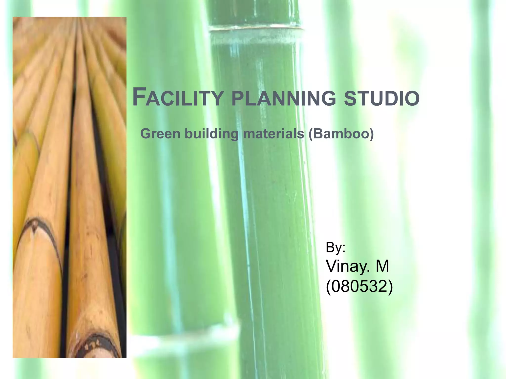 The document discusses bamboo as a sustainable building material. Some key points: