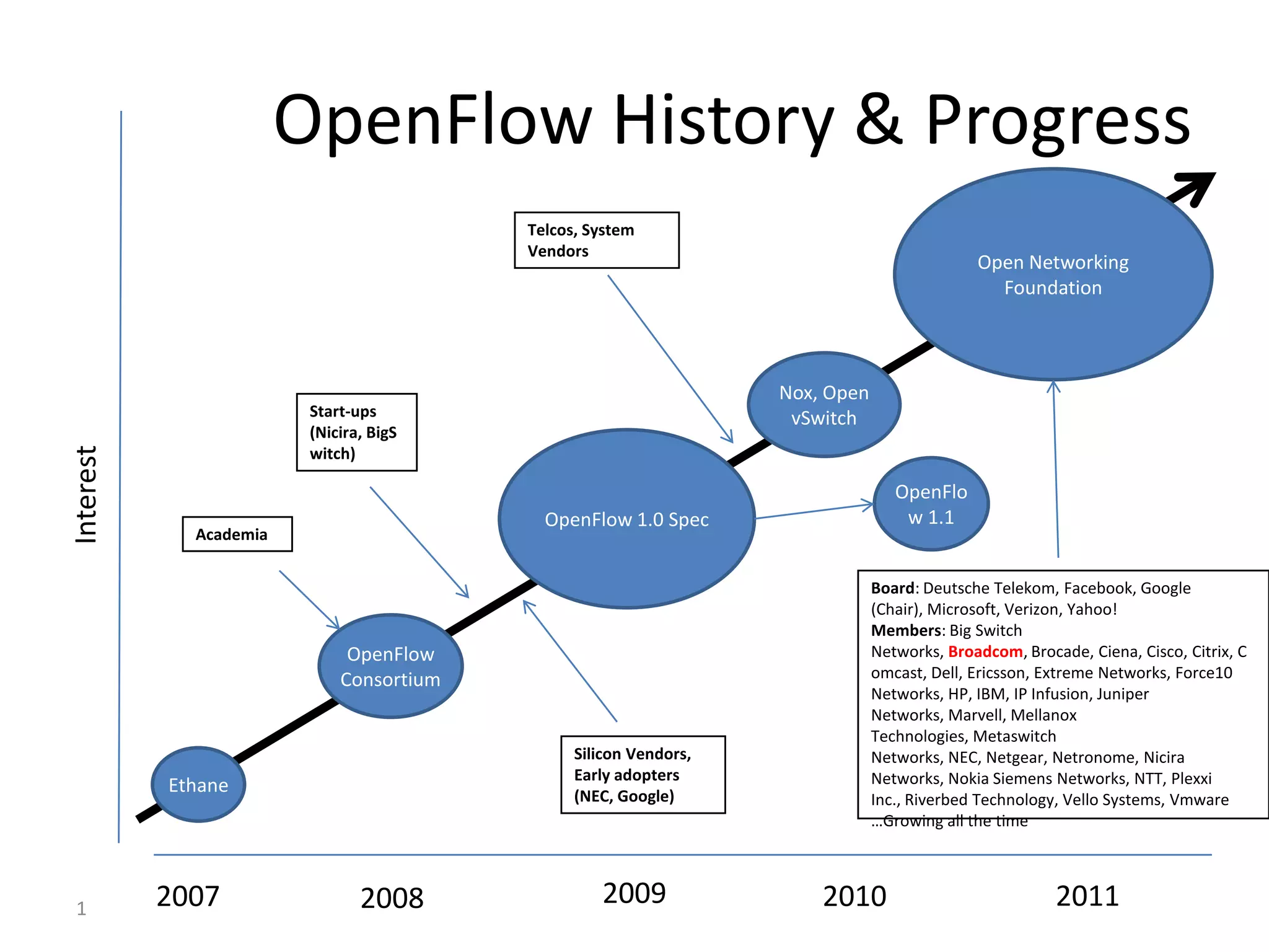The document discusses the history and progress of OpenFlow and SDN. It traces OpenFlow from its origins in academia in 2007 to its growing adoption by major tech companies and standardization through the Open Networking Foundation by 2011. It outlines how OpenFlow allows centralized control of network traffic through software-defined controllers that programmatically configure flow-based forwarding using the OpenFlow protocol in switches.