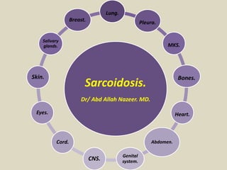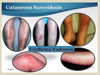 Sarcoidosis is an inflammatory disease characterized by non-caseating granulomas that can affect multiple organ systems. Pulmonary involvement occurs in up to 90% of patients and includes hilar and mediastinal lymphadenopathy in 95% of cases. On imaging, sarcoidosis demonstrates various patterns including micronodules with perilymphatic distribution, pulmonary masses/nodules, reticulation, ground glass opacities, and pleural effusion in rare cases. High-resolution CT is useful for evaluating the wide variety of radiological manifestations of pulmonary and extra-pulmonary sarcoidosis.