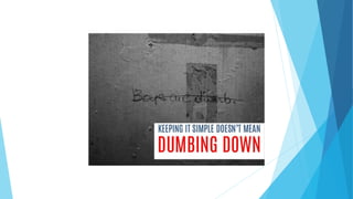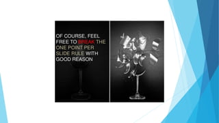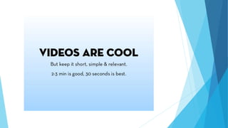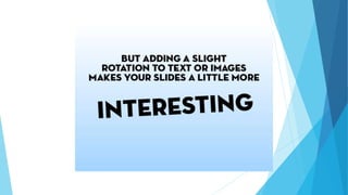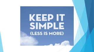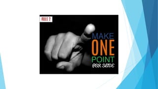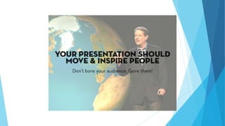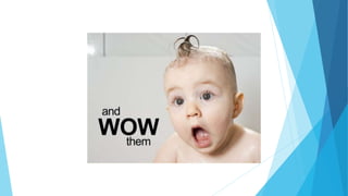 The document provides 7 tips for creating a wow-worthy PowerPoint presentation: 1) Start with an engaging question; 2) Keep presentations short with 1 idea per slide and limit text; 3) Use color effectively to support the presentation without being distracting; 4) Simplify complex ideas for accessibility; 5) Show your personality to engage the audience authentically; 6) Mix up the presentation with variations like videos or polls; 7) End with a clear call-to-action for the audience to take next steps.
