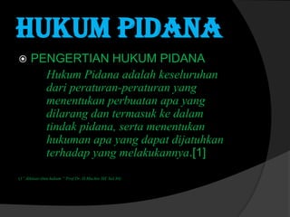 Dokumen tersebut merupakan ringkasan singkat tentang pengertian hukum pidana menurut beberapa ahli. Secara garis besar, hukum pidana adalah aturan yang menentukan perbuatan apa yang dilarang dan sanksi apa yang dapat diberikan bagi pelanggarnya."