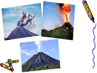 Volcanoes are formed when molten rock, or magma, rises up from below the Earth's surface through cracks, called vents, caused by the movement of tectonic plates. The magma exits through these vents and creates landforms on the surface, such as craters at the top of volcanoes. Volcanoes can be classified as active if they erupt frequently, extinct if they were once active but will not erupt again, or dormant if they were previously active but have not erupted recently, although future eruptions are possible.