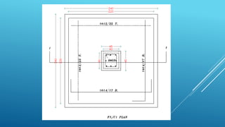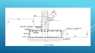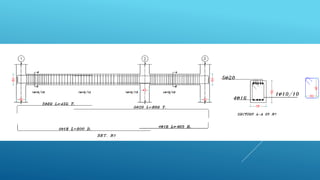 This document outlines the design of the structural system for the Terra Santa School project in Jericho, Palestine. The school consists of three blocks designed using reinforced concrete. The document describes modeling the structure in SAP2000, analyzing seismic and gravity loads, and designing the structural elements including shear walls, columns, beams, and foundations according to code specifications. Analysis methods like response spectrum analysis and equivalent lateral force are used to design for seismic loads. Reinforcement is designed for various structural elements based on strength calculations.