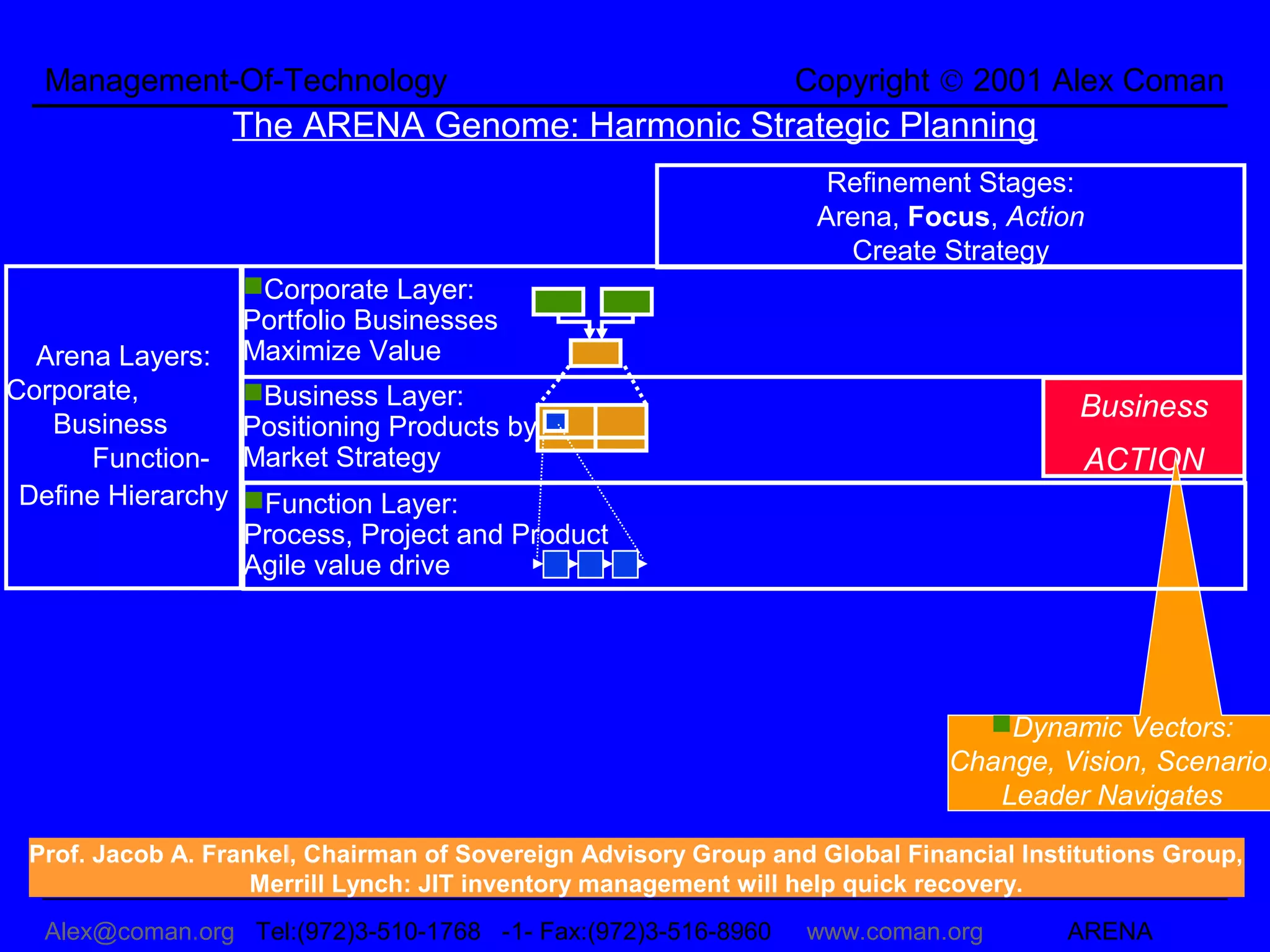 The document discusses strategic planning and management of technology using the ARENA framework. It presents the ARENA framework which consists of three layers - the corporate, business, and function layers. It then provides examples of different business actions companies can take at each layer, such as skimming, storming, flooding, and piercing, to introduce, establish, and grow new technologies. It also discusses frameworks for assessing technologies based on their impact and importance, as well as challenges that can arise when development cycles do not align with product life cycles.