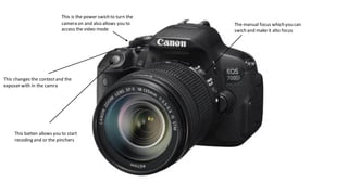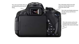 This document provides instructions for various parts of a camera, including the power switch, viewfinder, memory card slot, record button, manual focus switch, exposure control, start/stop recording button, light setting button, image quality settings, and settings button. It describes the basic functions of these parts to operate the camera and capture and store video and images.