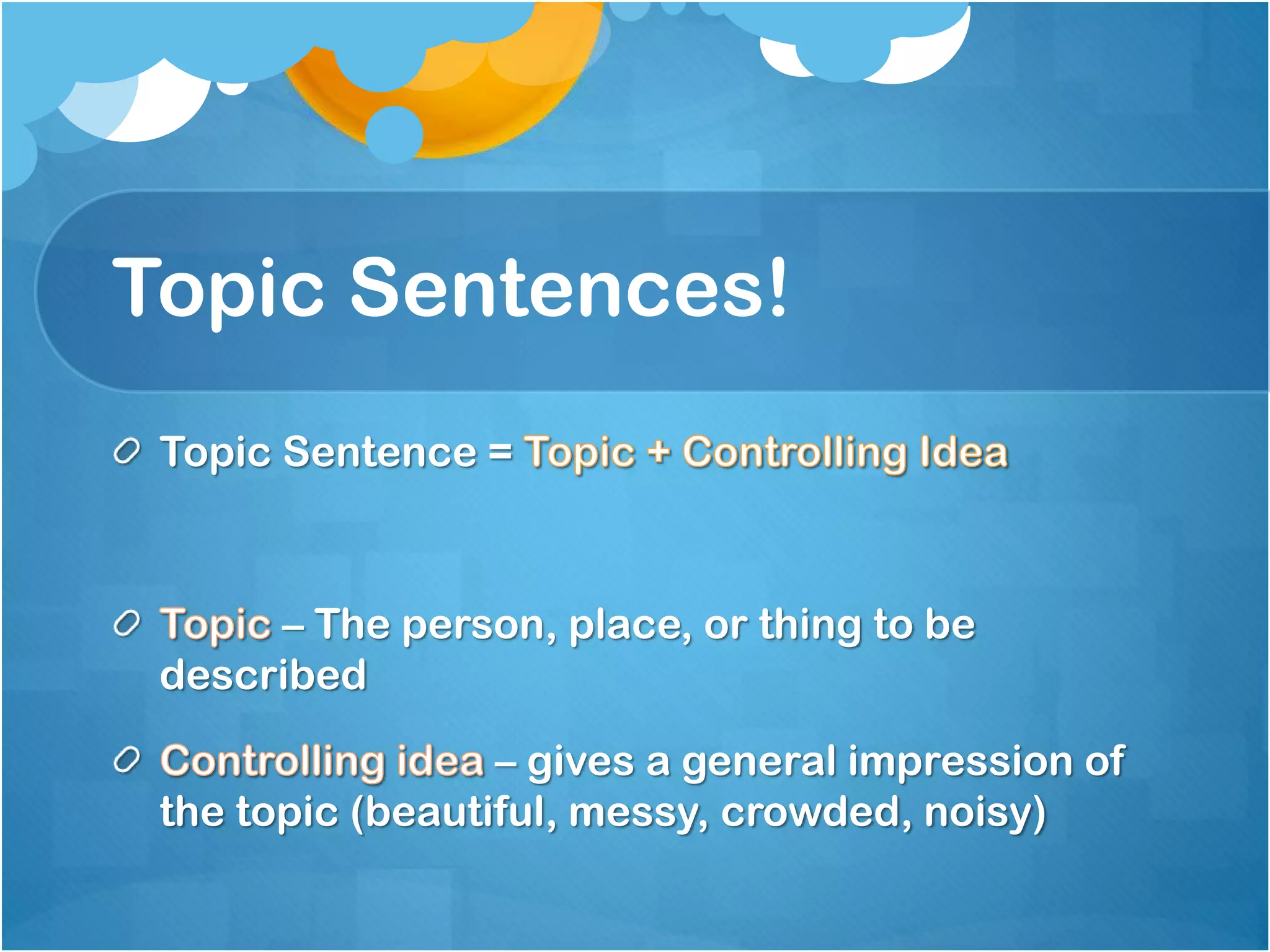 This document discusses topic sentences and how to write effective ones. It explains that a topic sentence should introduce the subject being described, such as a person, place, or thing, and provide an initial impression. It provides examples of topic sentences and notes that concluding sentences can either restate the topic sentence using different words, restate it and provide the writer's opinion, or restate it and convey feelings about the topic. The document emphasizes using specific, precise details in supporting sentences to help readers visualize what is being described.