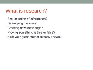 The document discusses the concepts of research, the scientific method, and big data. It defines research as the systematic pursuit of knowledge to describe facts and observations, explain relationships between variables, and predict outcomes based on theories and models. The scientific method is described as cumulative, iterative, and objective but also influenced by values and beliefs. The document cautions that research studies often only apply conditionally and their results may not extrapolate if the conditions change. It notes that predicting human behaviors is more difficult than chemical reactions since people can alter their actions based on research findings. Finally, the document discusses how big data and data-driven decision making are influencing many fields but that larger data also increases potential for bias.