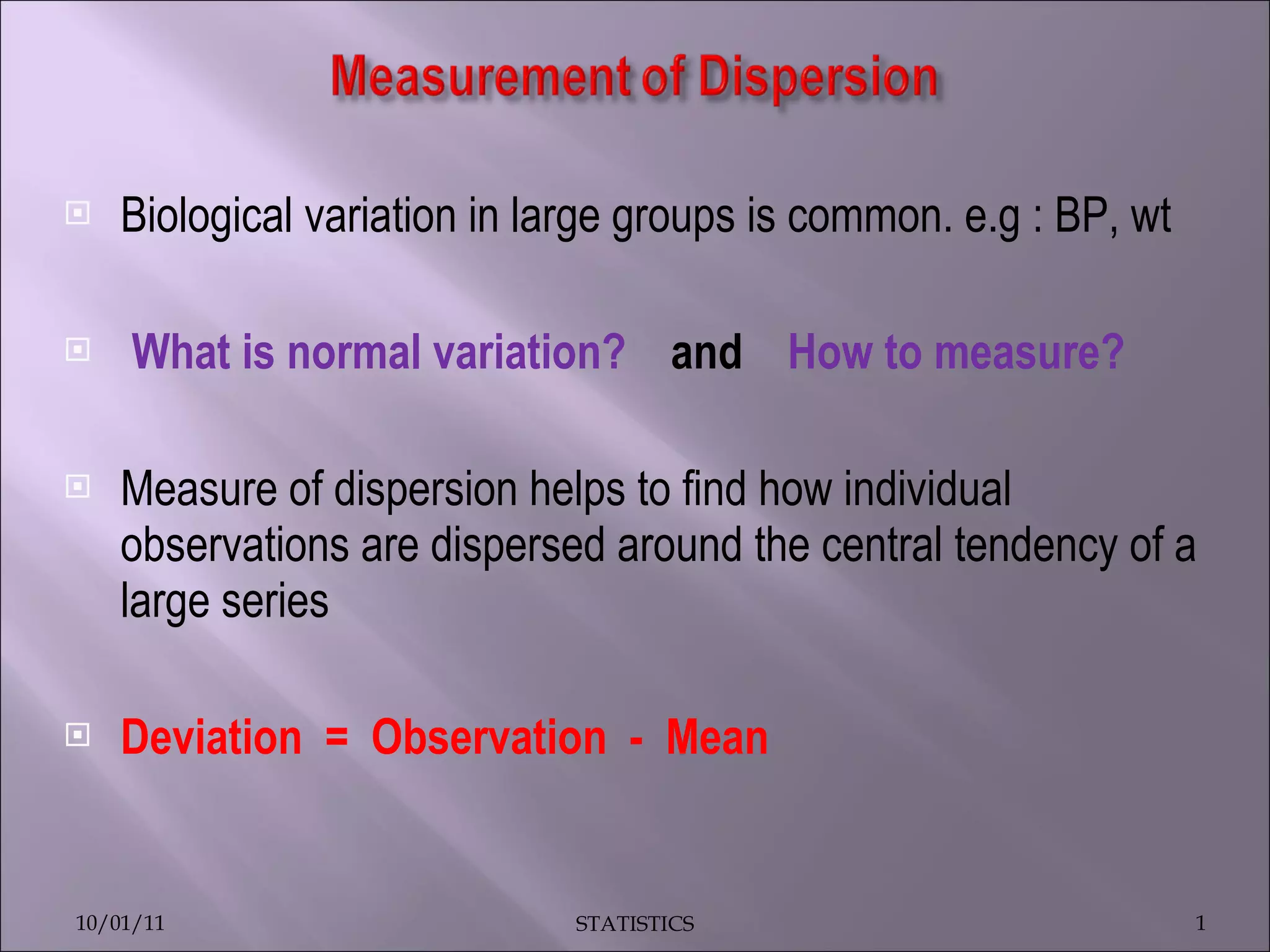 This document discusses various statistical concepts such as measures of central tendency, measures of dispersion, standard deviation, normal distribution, and tests of significance. It provides examples and formulas to calculate range, mean deviation, standard deviation, z-scores, confidence intervals, and the chi-square test. Biological variation is common and various statistical methods can be used to analyze data and find patterns in large datasets.