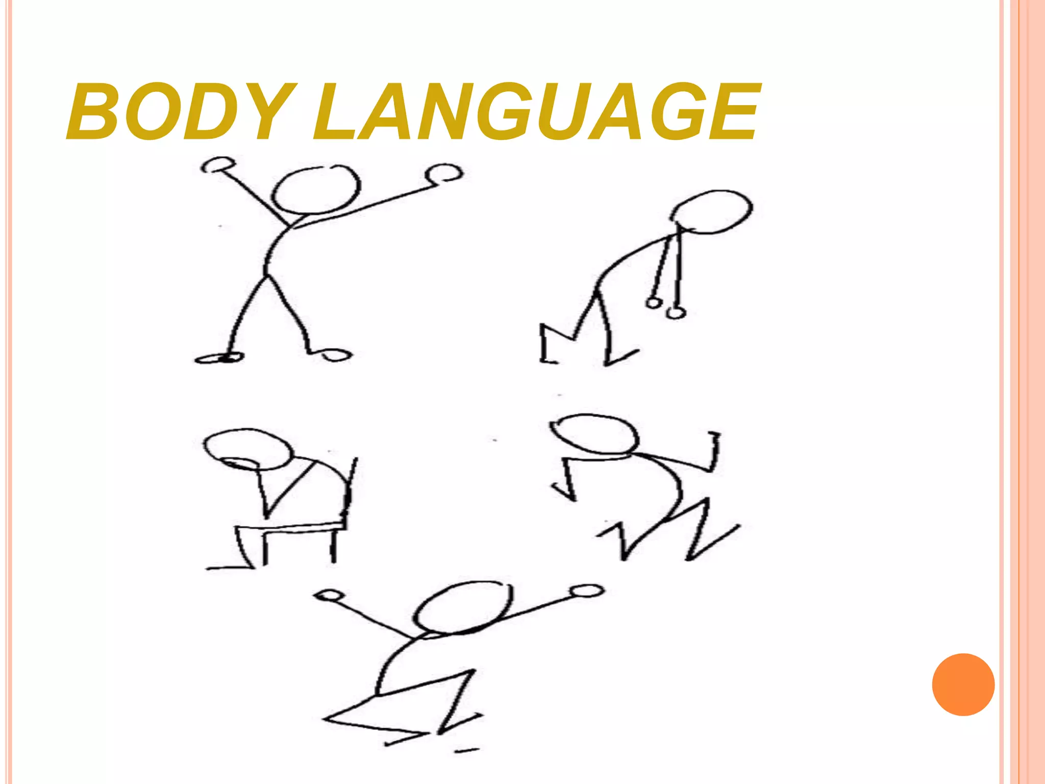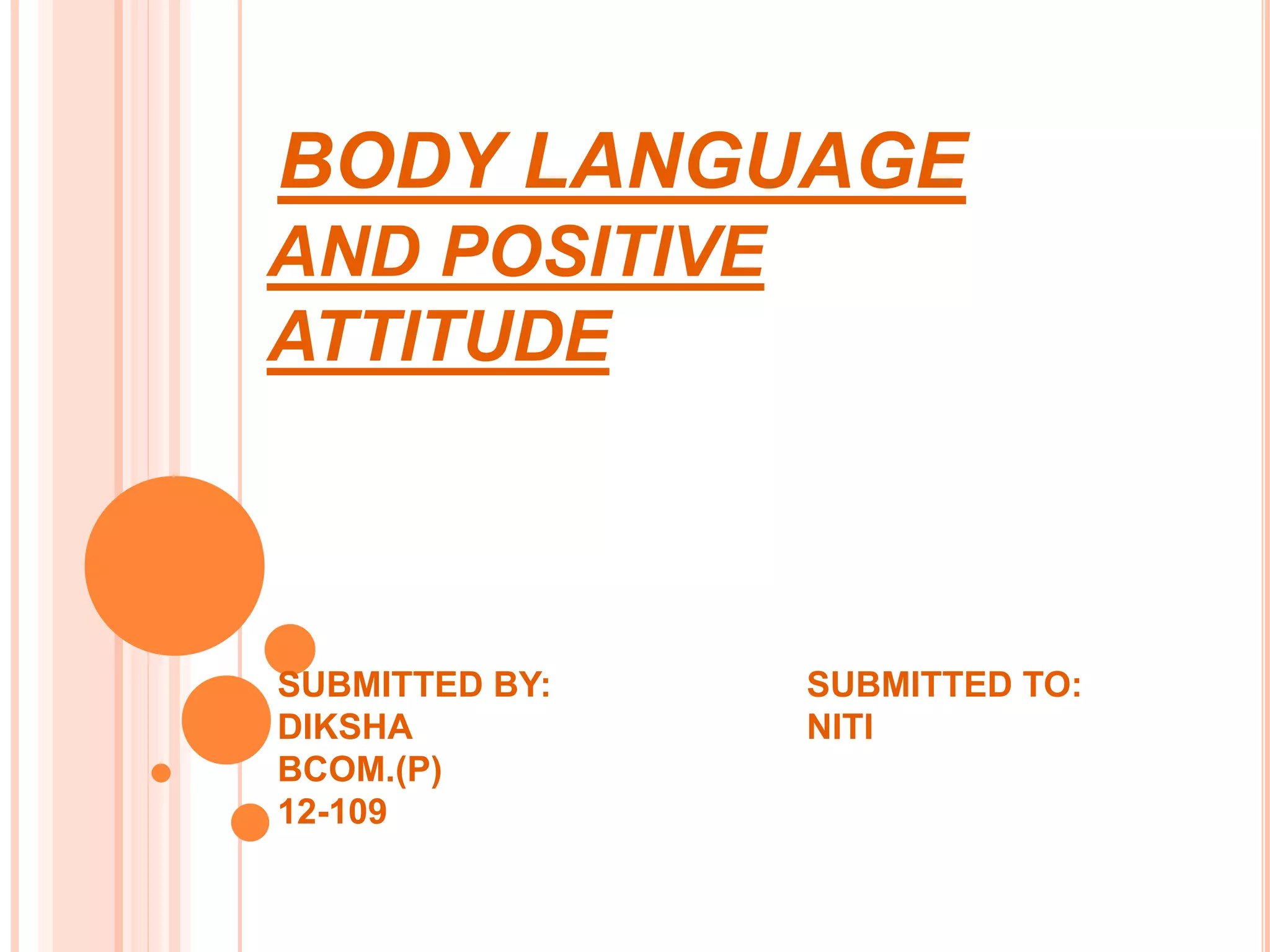 This document provides tips for positive body language and attitude. It recommends keeping arms and legs uncrossed, relaxing shoulders, avoiding touching one's face, maintaining eye contact without staring, not standing too close to others, keeping a relaxed attitude, and not holding anything in front of the heart. It also suggests adopting a positive attitude by reading inspiring books, planning one's week, understanding that not everything will go as planned, getting spiritual connection, and surrounding oneself with positive people.