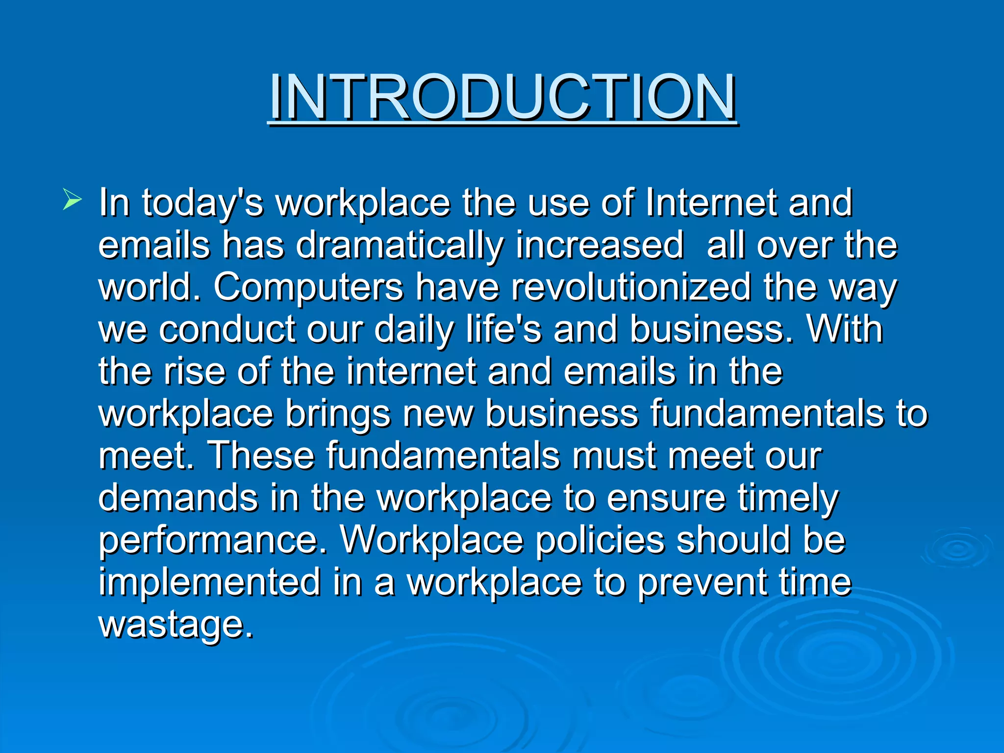 The document discusses internet and email policies in the workplace. It defines internet and email and discusses how companies should develop acceptable use policies to guide employee use of company systems and information. The policies should be developed through consultation, clearly define employee rights and obligations, and cover implementation and conflict resolution procedures.