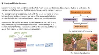 The document discusses key economic concepts related to scarcity and choice. It explains that economies face scarcity because resources are limited but human wants are unlimited. This creates an economic problem where choices must be made about how to allocate scarce resources. For example, a farmer with a limited land area must choose whether to grow wheat or cotton. The Production Possibility Curve is used to graphically illustrate scarcity and tradeoffs, showing that increasing one good requires decreasing another. Microeconomics analyzes individual agents like households and firms and how they interact in markets. Macroeconomics looks at the overall economy, factors like employment, growth and public policy that impact production, consumption, saving and investment.