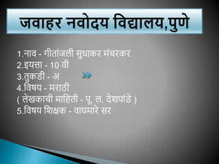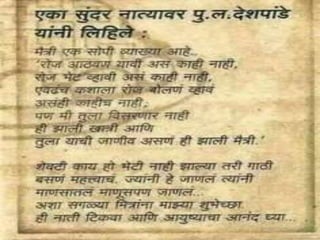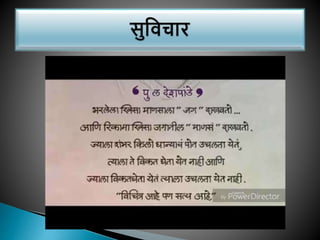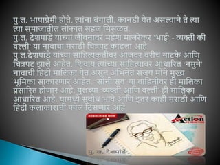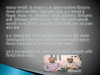 Purushottam Laxman Deshpande (alternatively written as Pu La Deshpande; 8 November 1919 – 12 June 2000), popularly known by his initials ("Pu. La.") or as P. L. Deshpande, was a Marathi writer and humorist from Maharashtra. He was also an accomplished film and stage actor, script writer, author, composer, musician, singer and orator. He was often referred to as "Maharashtra's beloved personality".[