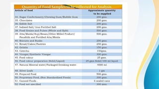 This document discusses sampling and food testing. It begins by defining sampling as selecting a portion of a food lot to represent the whole lot. Samples are collected for various purposes like surveillance, data collection, or determining if a product meets standards. The objectives of food testing are then outlined as protecting public health, detecting fraud, ensuring compliance with standards, and more. Legal provisions related to sampling and analysis from the Food Safety and Standards Act are described. Key definitions used in sampling like lot, sample, and composite sample are explained. Acceptance sampling plans including attribute and variables plans are covered. Health and safety precautions for sampling and general principles for legal sampling are provided. Finally, various tools used for sampling different types of foods are identified.