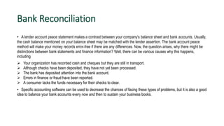 The document outlines the importance of bank reconciliation in accounting, contrasting company balance sheets with bank statements to identify discrepancies. It details the steps for performing bank reconciliation, emphasizing the need for regular checks to maintain accurate financial records and detect errors or fraud. Additionally, it highlights the accounts that should be reconciled monthly to ensure reliability in financial reporting.