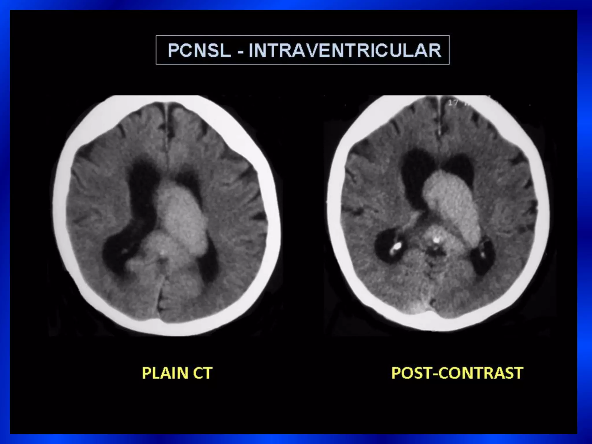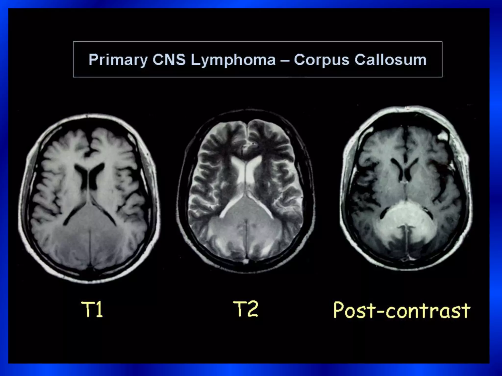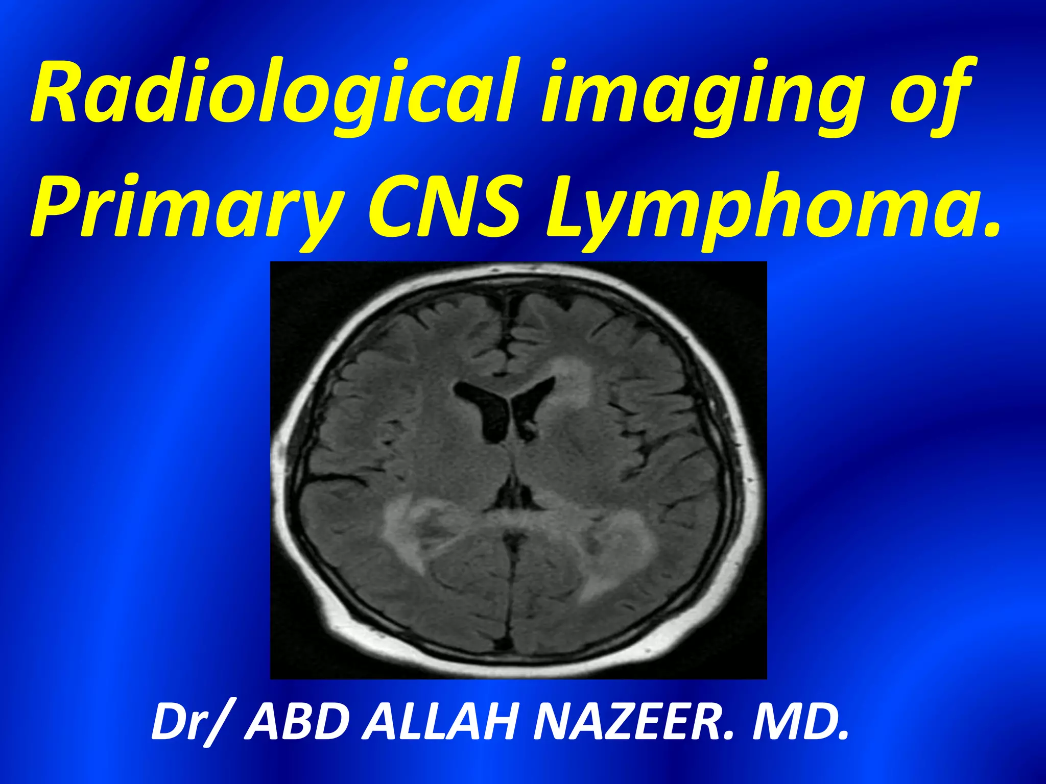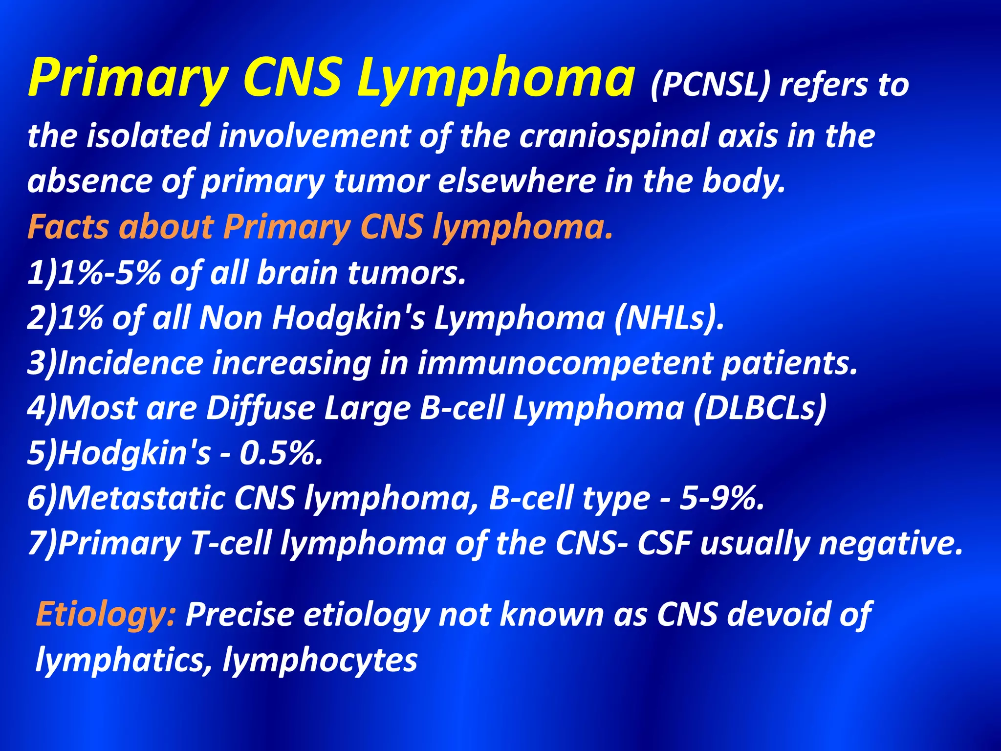 Primary central nervous system lymphoma (PCNSL) refers to lymphoma isolated to the brain and spinal cord. Imaging plays an important role in diagnosis. On CT, PCNSL typically appears as a hyperdense, solitary mass without necrosis or hemorrhage. On MRI, it has intermediate-low T1 signal, iso-hypointense T2 signal, and homogeneous enhancement. Location is commonly the supratentorial white matter. In immunocompromised patients, PCNSL can appear atypical with multiple lesions, necrosis, and heterogeneous enhancement. Advanced techniques like perfusion MRI and PET can aid in differentiating PCNSL from other tumors like glioblastoma and metastasis.