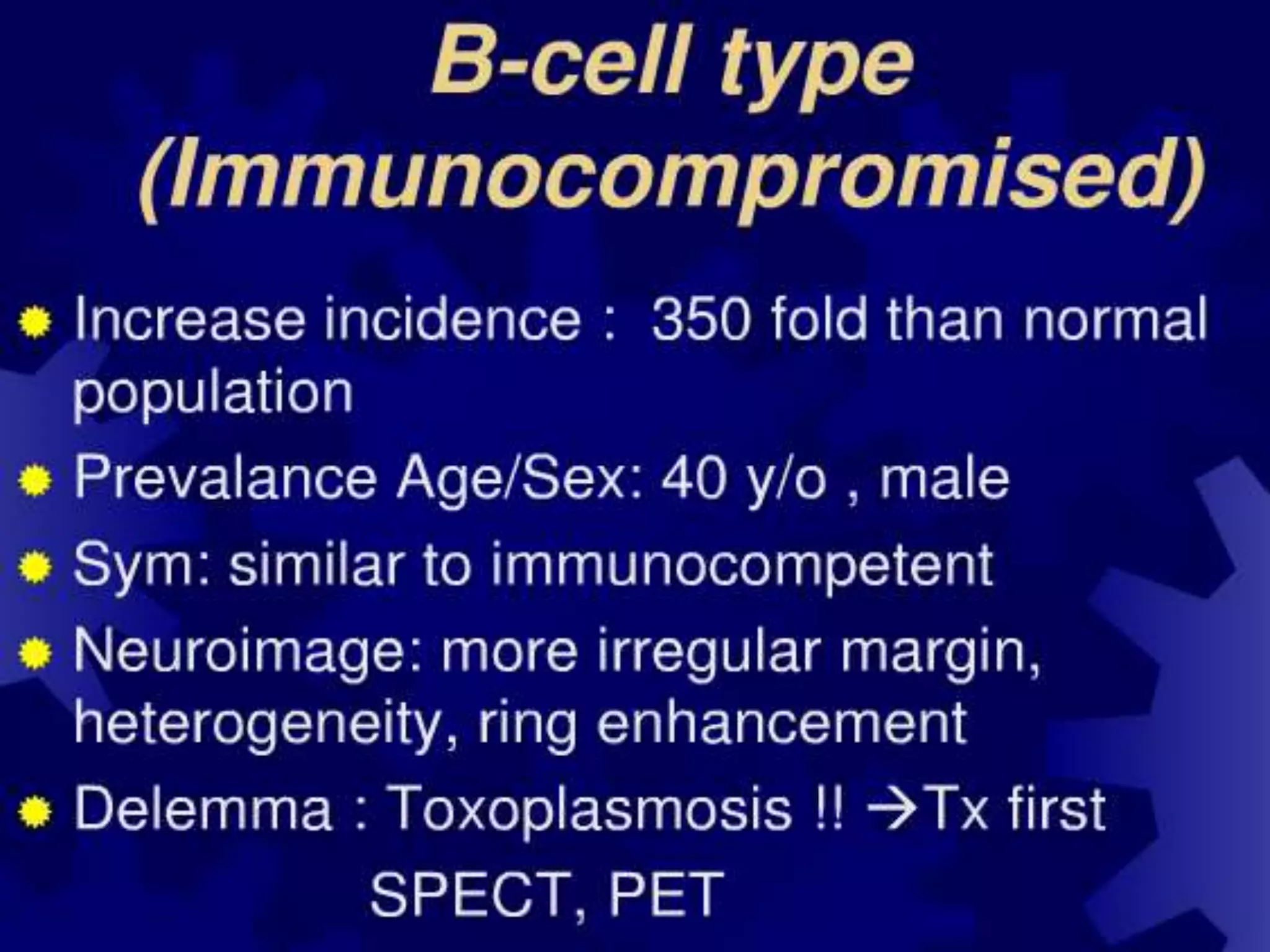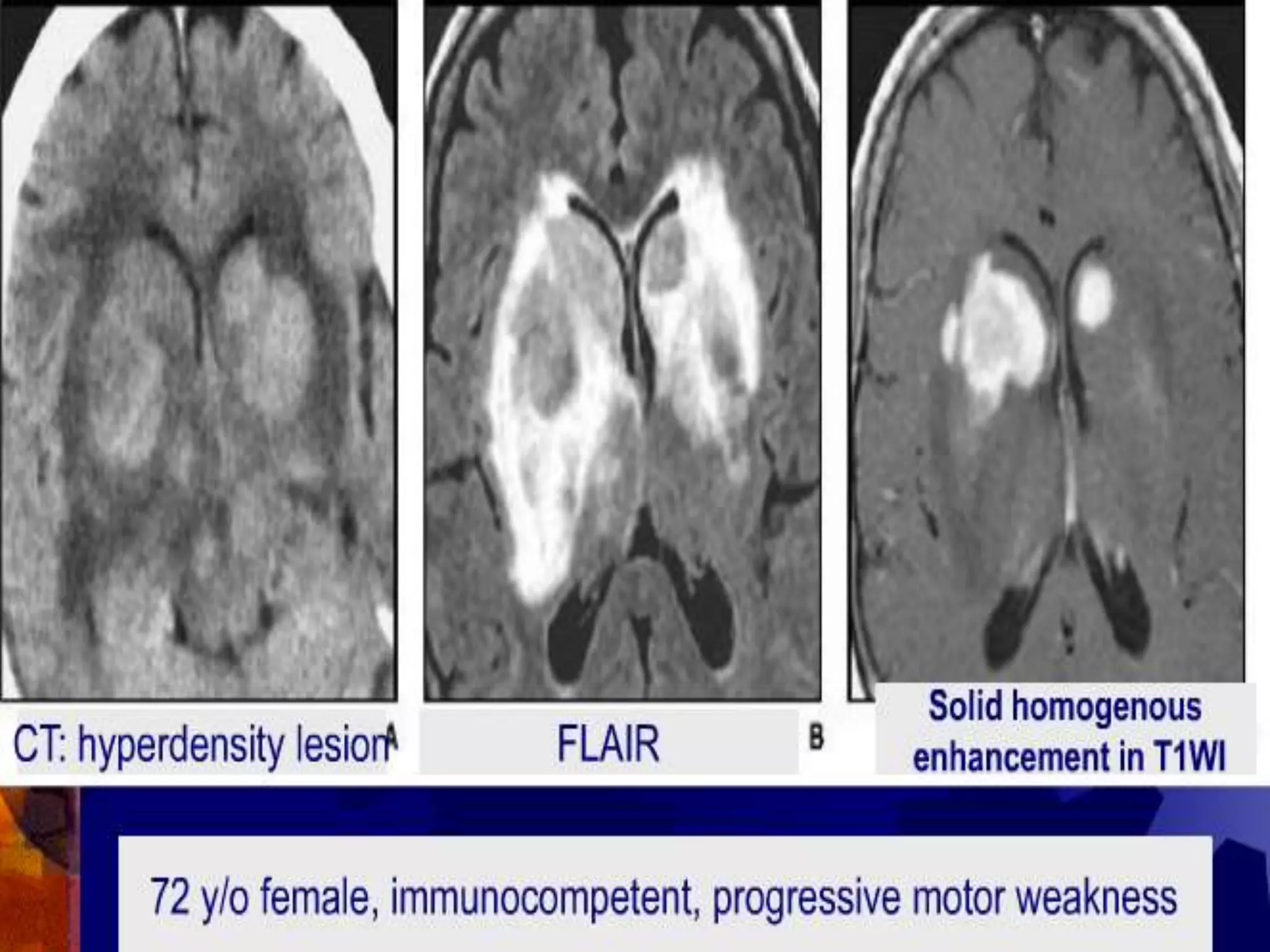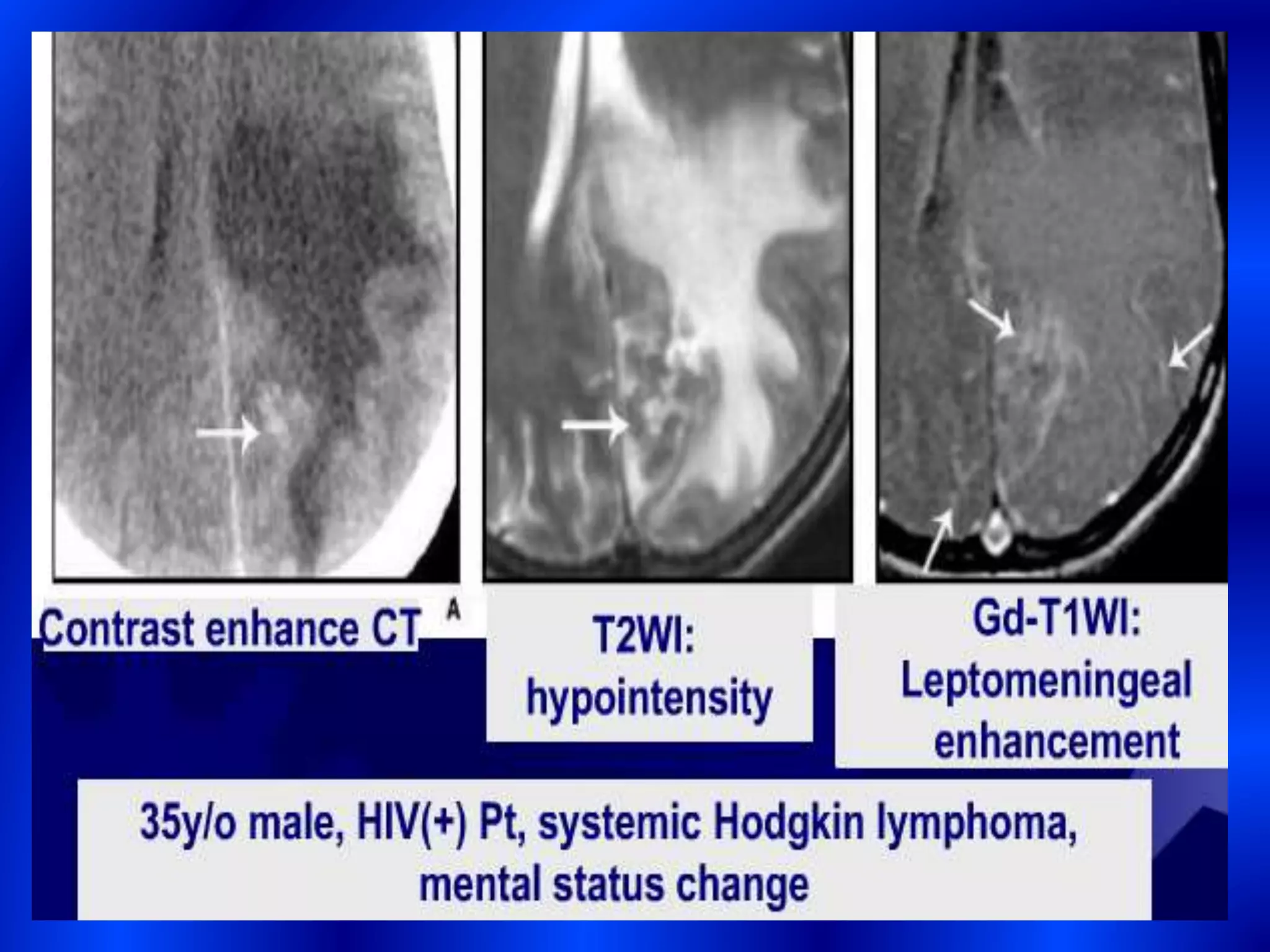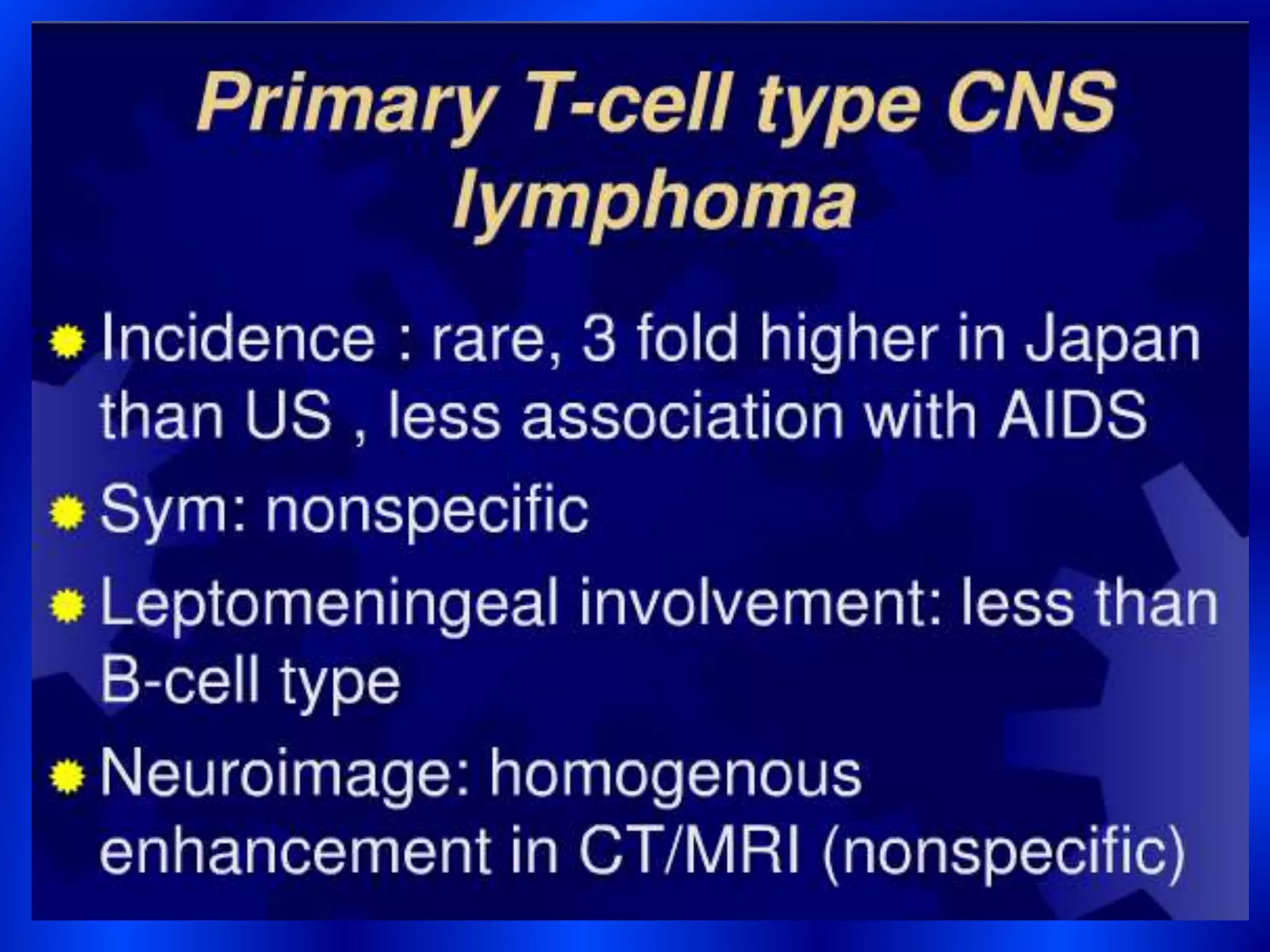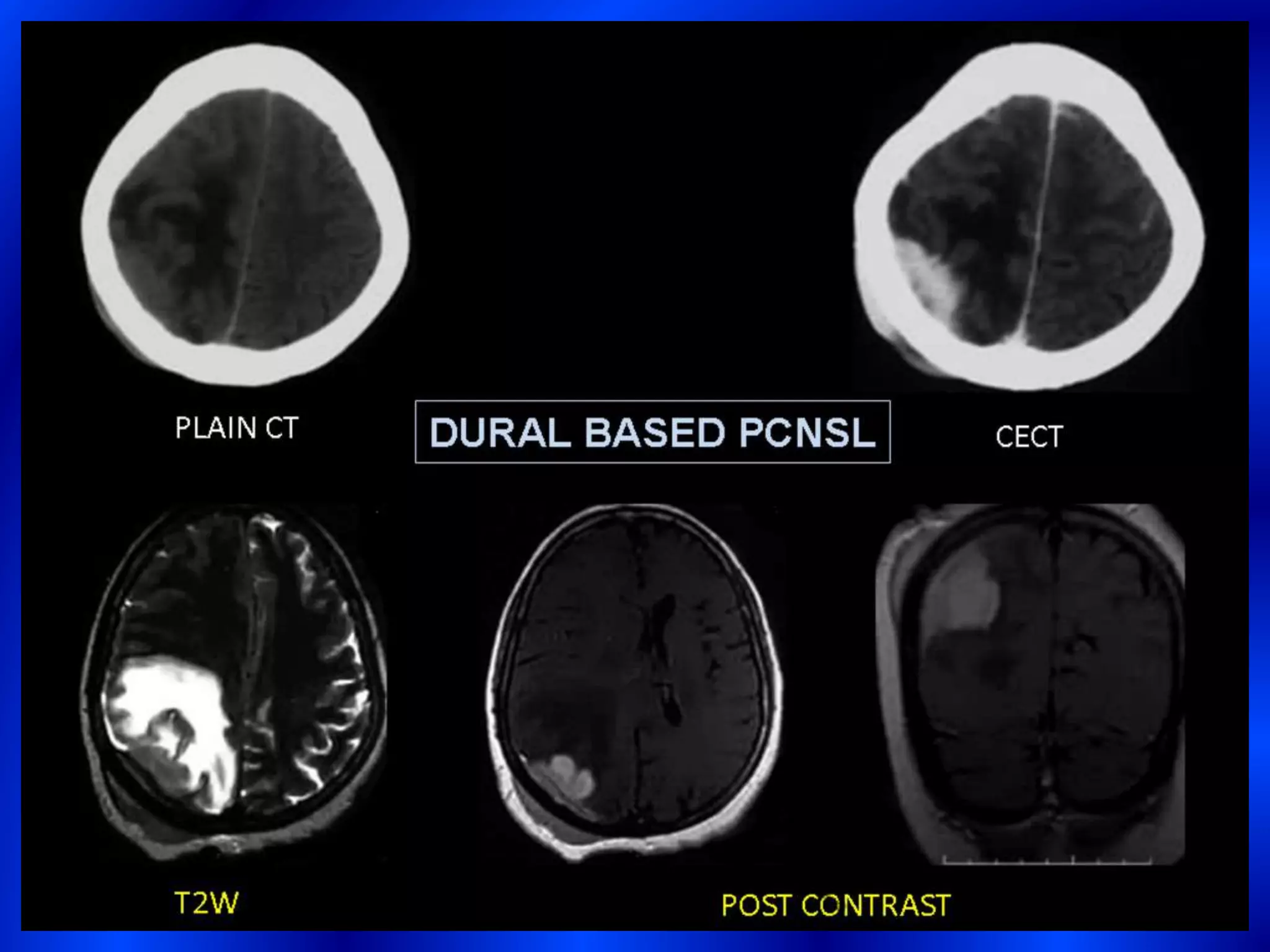 Primary central nervous system lymphoma (PCNSL) refers to lymphoma isolated to the brain and spinal cord. Imaging plays an important role in diagnosis. On CT, PCNSL typically appears as a hyperdense, solitary mass without necrosis or hemorrhage. On MRI, it has intermediate-low T1 signal, iso-hypointense T2 signal, and homogeneous enhancement. Location is commonly the supratentorial white matter. In immunocompromised patients, PCNSL can appear atypical with multiple lesions, necrosis, and heterogeneous enhancement. Advanced techniques like perfusion MRI and PET can aid in differentiating PCNSL from other tumors like glioblastoma and metastasis.