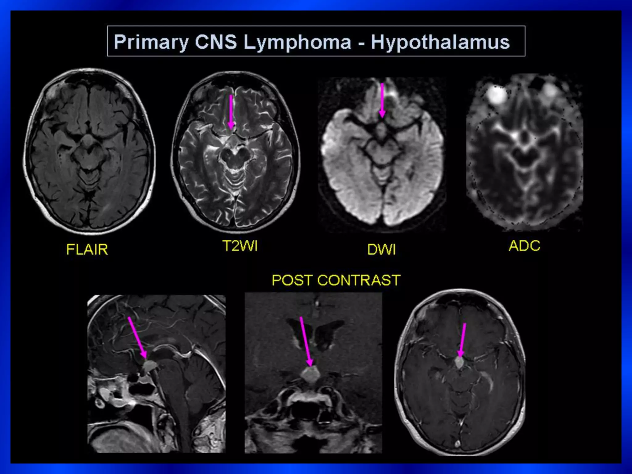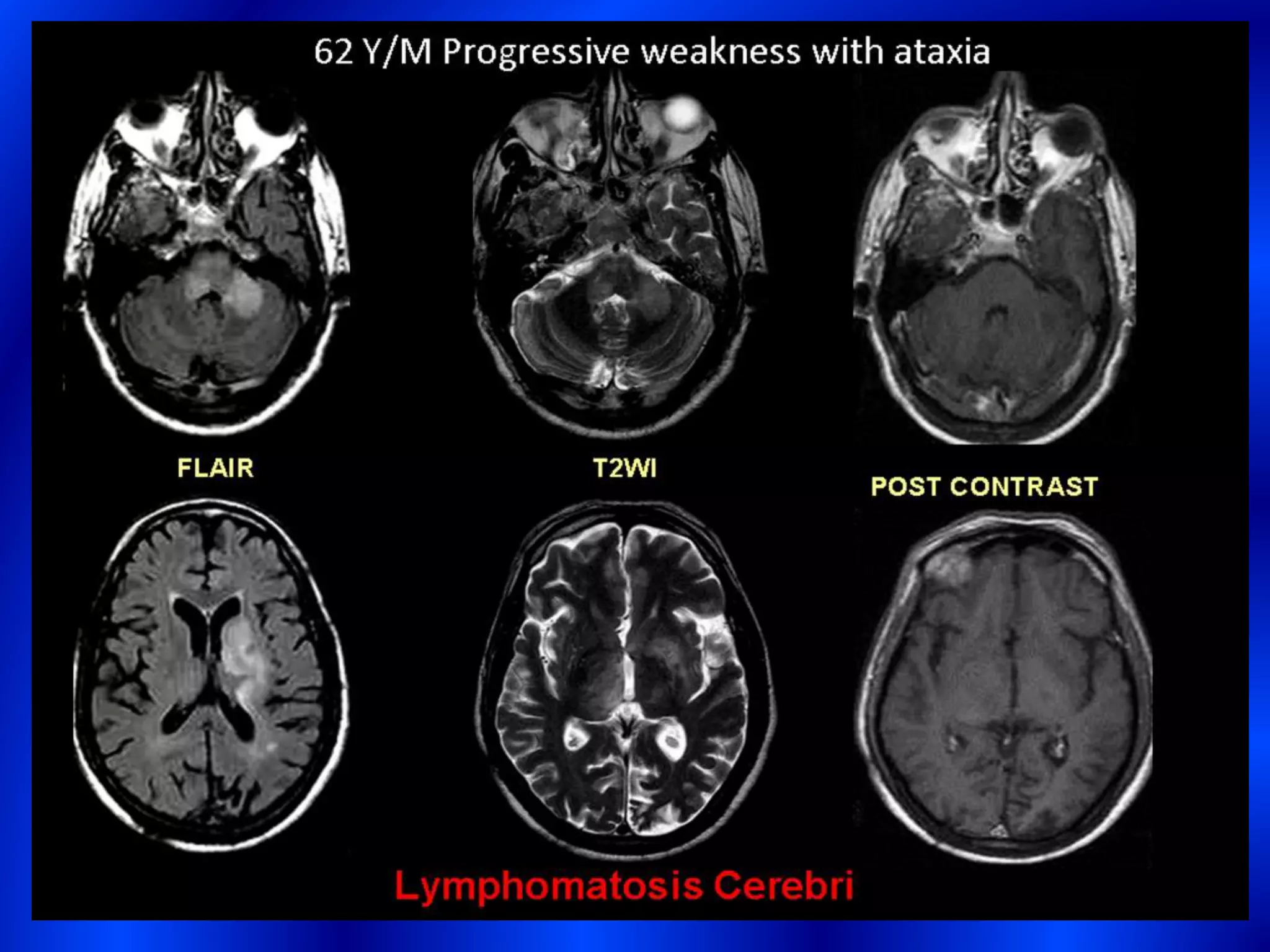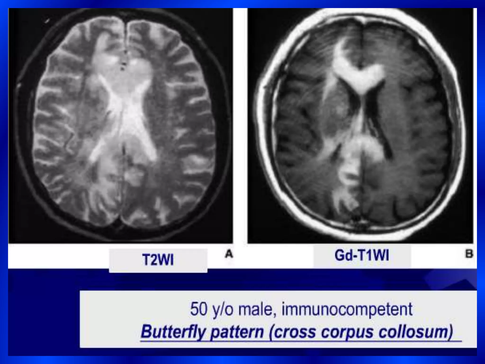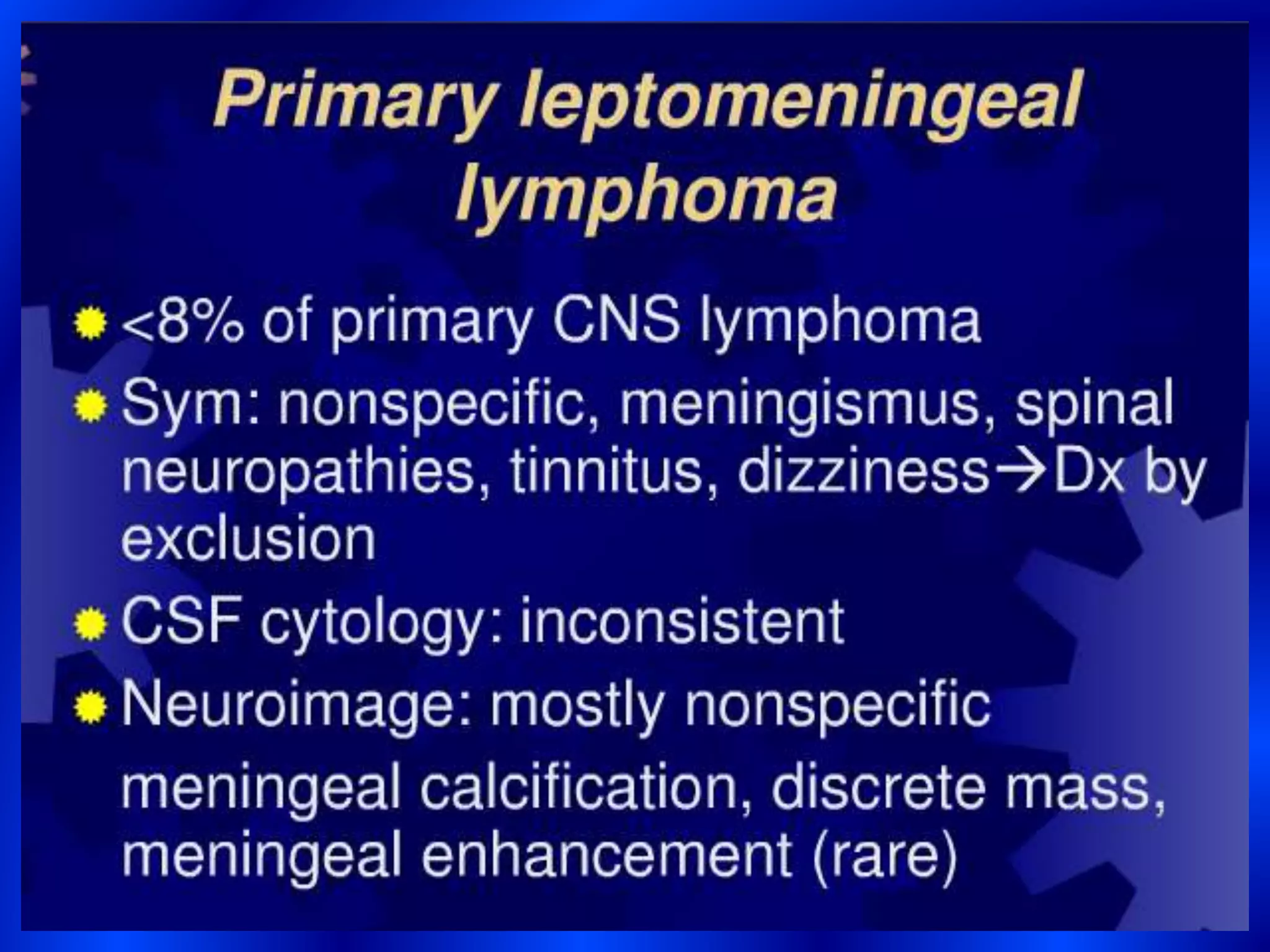 Primary central nervous system lymphoma (PCNSL) refers to lymphoma isolated to the brain and spinal cord. Imaging plays an important role in diagnosis. On CT, PCNSL typically appears as a hyperdense, solitary mass without necrosis or hemorrhage. On MRI, it has intermediate-low T1 signal, iso-hypointense T2 signal, and homogeneous enhancement. Location is commonly the supratentorial white matter. In immunocompromised patients, PCNSL can appear atypical with multiple lesions, necrosis, and heterogeneous enhancement. Advanced techniques like perfusion MRI and PET can aid in differentiating PCNSL from other tumors like glioblastoma and metastasis.