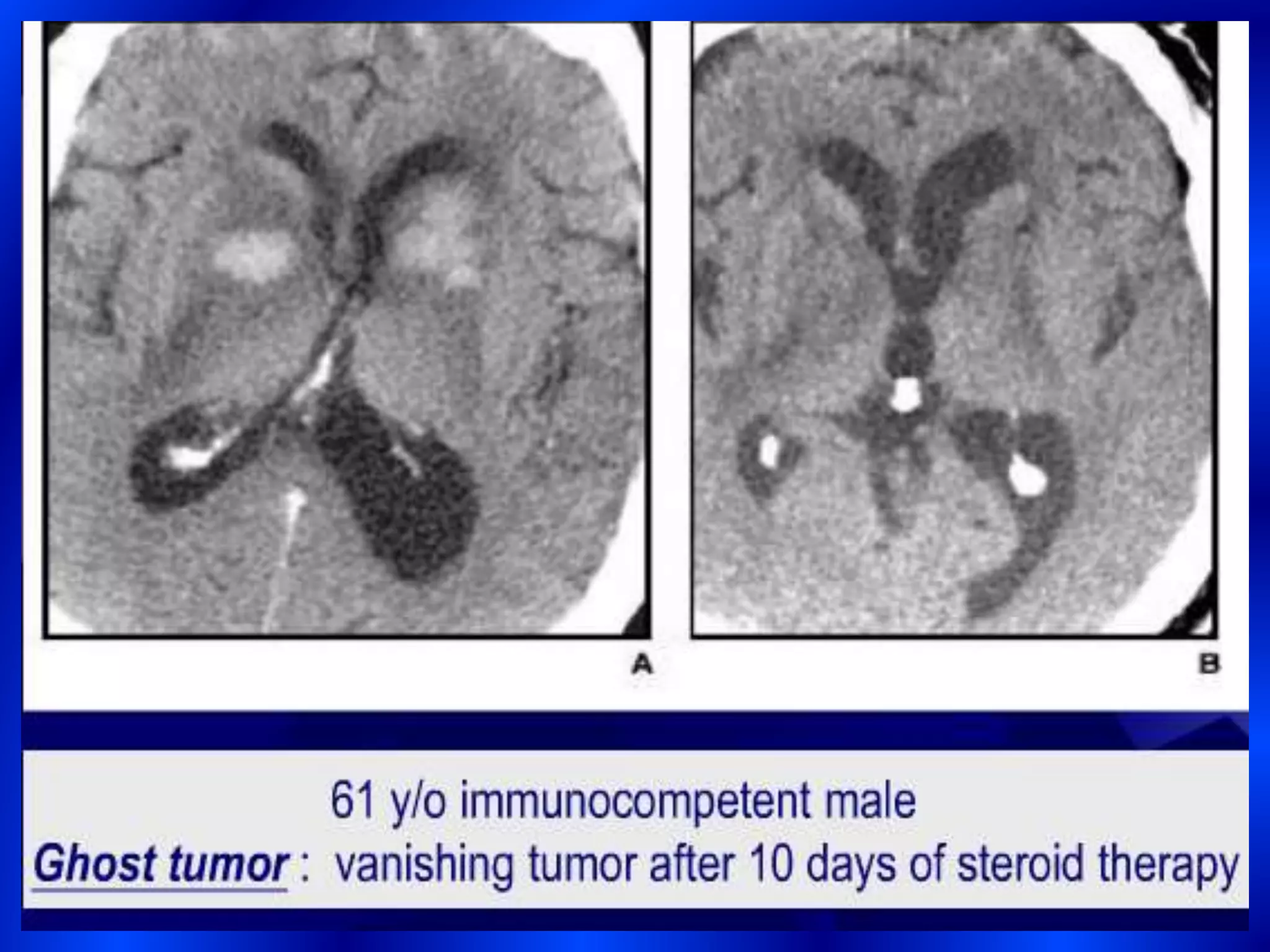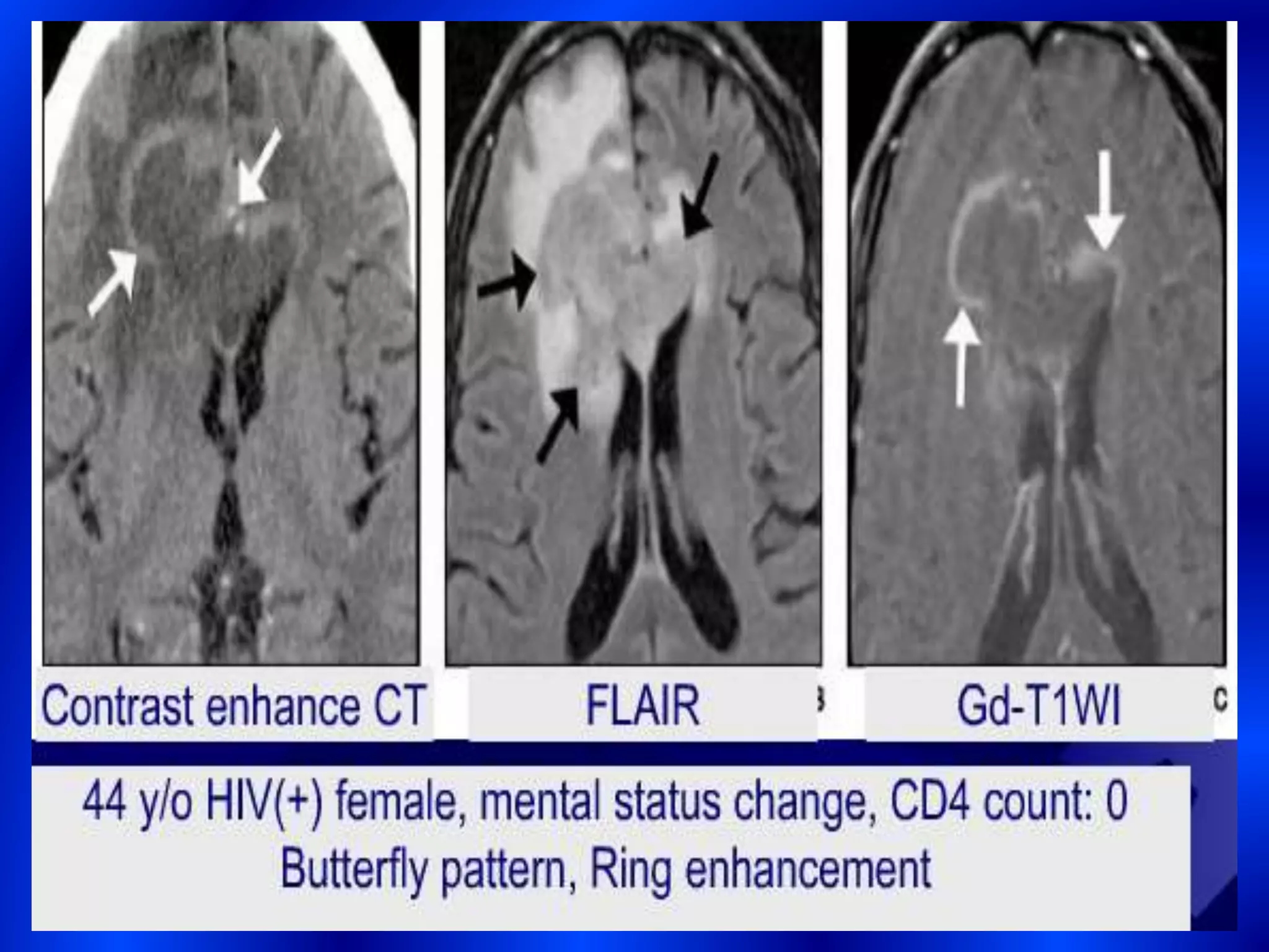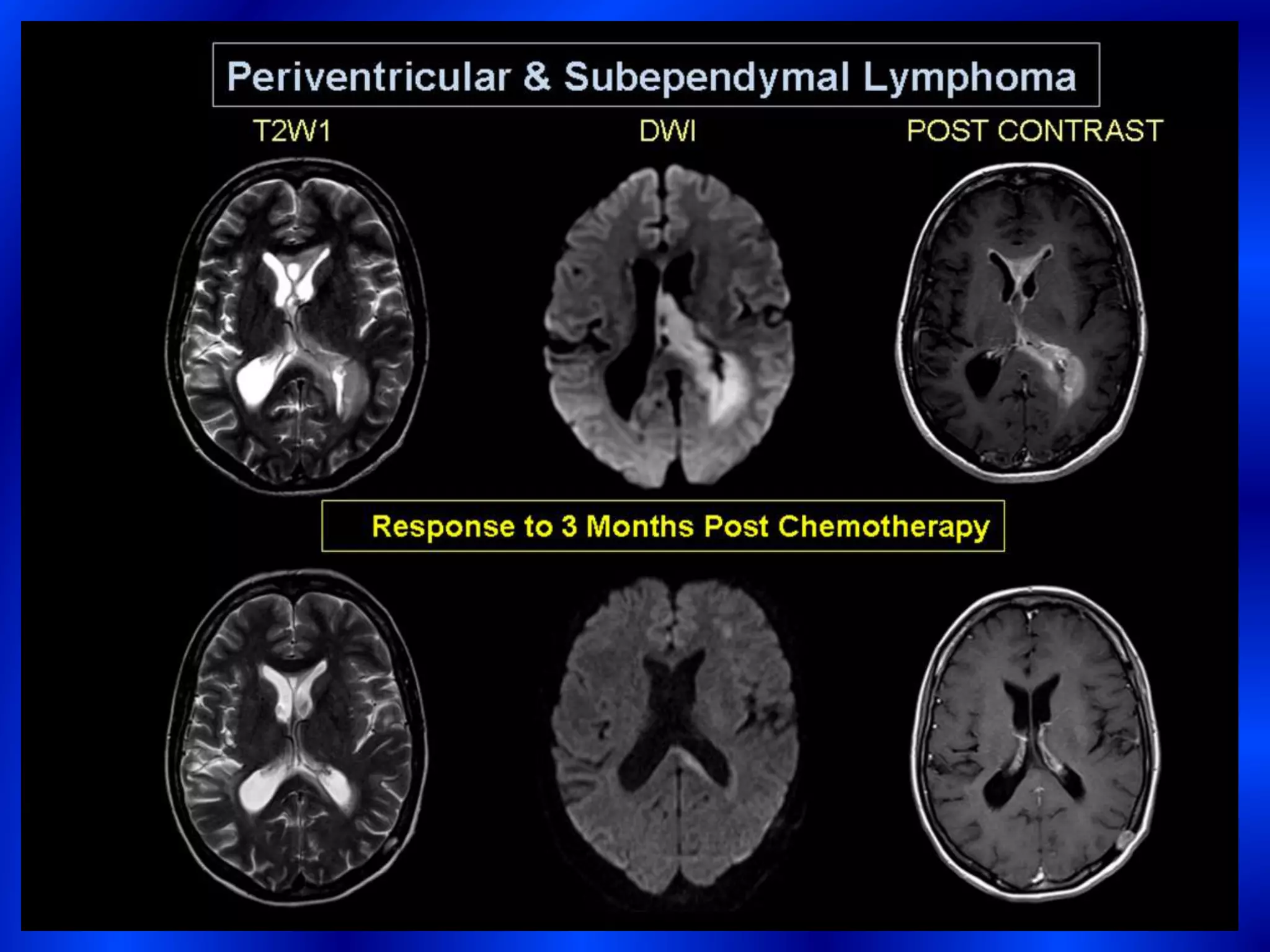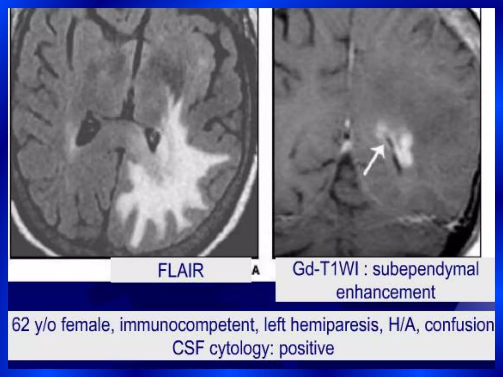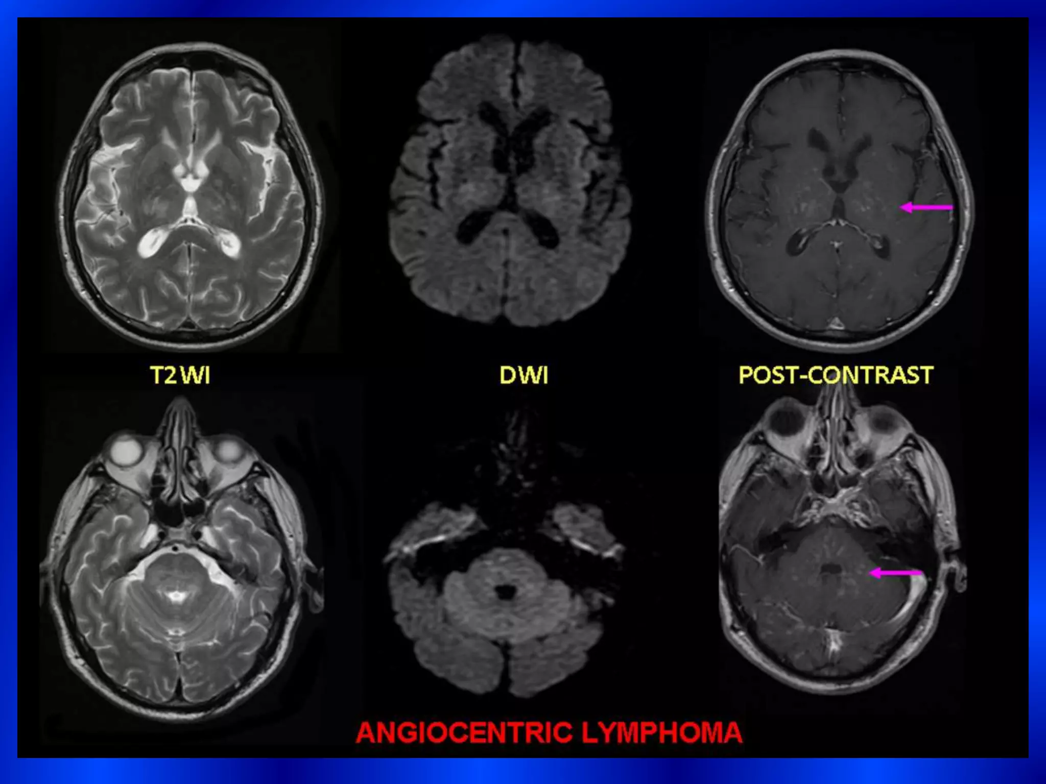 Primary central nervous system lymphoma (PCNSL) refers to lymphoma isolated to the brain and spinal cord. Imaging plays an important role in diagnosis. On CT, PCNSL typically appears as a hyperdense, solitary mass without necrosis or hemorrhage. On MRI, it has intermediate-low T1 signal, iso-hypointense T2 signal, and homogeneous enhancement. Location is commonly the supratentorial white matter. In immunocompromised patients, PCNSL can appear atypical with multiple lesions, necrosis, and heterogeneous enhancement. Advanced techniques like perfusion MRI and PET can aid in differentiating PCNSL from other tumors like glioblastoma and metastasis.