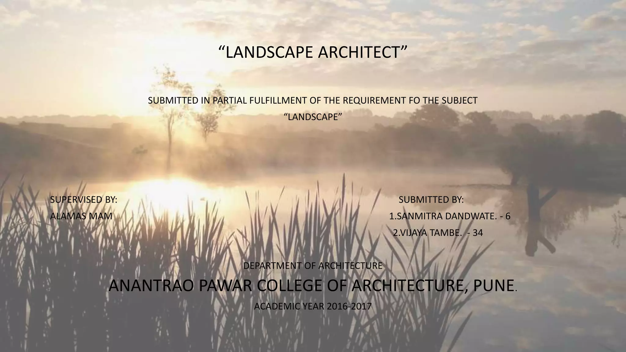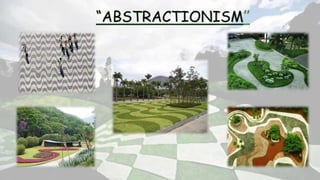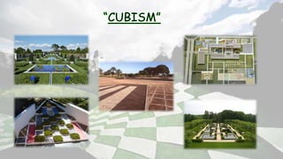 This document is a submission for a landscape architecture course that summarizes the work of renowned Brazilian landscape architect Roberto Burle Marx. It outlines his influences, design principles, and notable projects. Marx developed a modernist style using native Brazilian plants and drew from art movements like cubism and abstractionism. He is known for his sculptural use of vegetation and innovative designs incorporating water features, pavements, and public spaces that provided dignity for all.