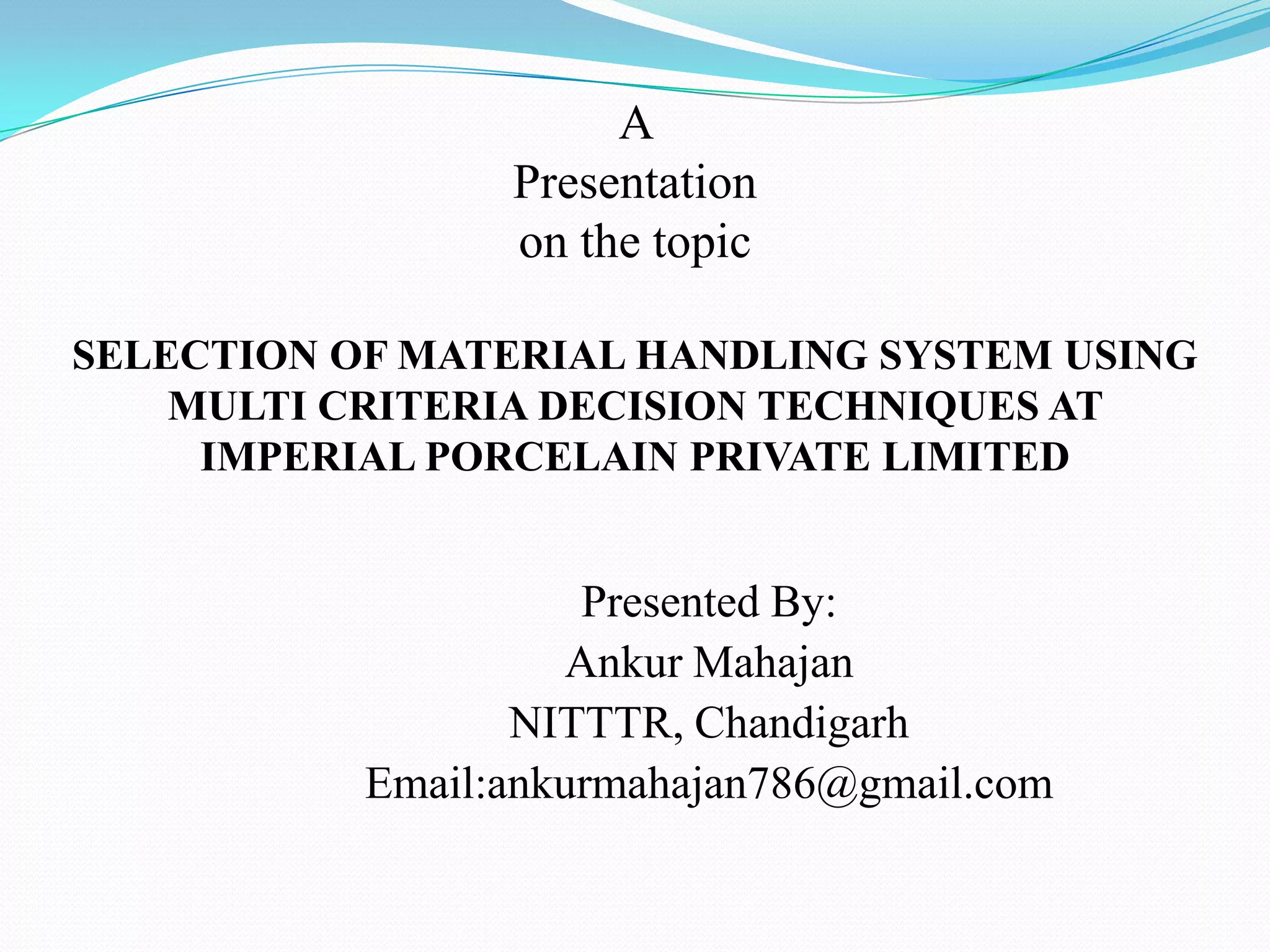 The document provides details about selecting a material handling system for Imperial Porcelain Private Limited using multi-criteria decision techniques. It discusses identifying criteria such as product characteristics, conveying speed, cost, etc. and listing alternatives like chain driven roller conveyor, flat belt conveyor, screw conveyor. It proposes using the Analytical Hierarchy Process (AHP), Analytic Network Process (ANP) and Technique for Order Preference by Similarity to Ideal Solution (TOPSIS) techniques to rank the alternatives based on the selected criteria and select the most suitable system. The methodology involves developing a decision tree, determining objective factor measures, pairwise comparison matrices and priority vectors to make the final selection.