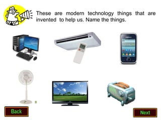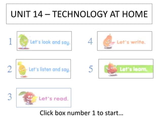 This short document introduces technology items found in homes and prompts the reader to name modern inventions that help people. It provides an introduction to unit 14 on technology at home and directs the user to click box number 1 to begin or press back to return to the main menu.