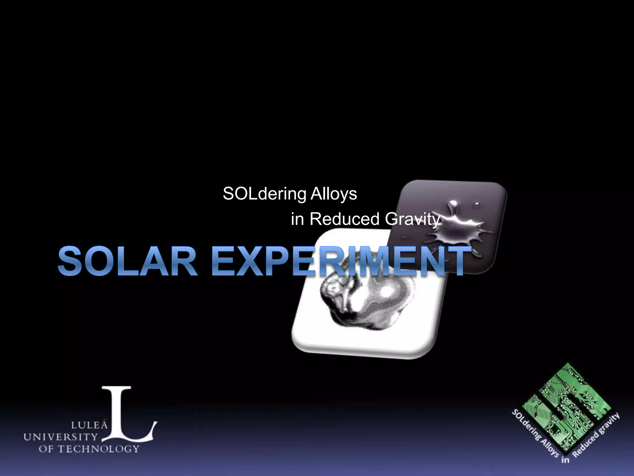 The document describes a proposed experiment to study soldering in reduced gravity. It will test soldering 9 samples in different environments: atmosphere, vacuum, and vacuum with gas flow. Sensors will measure temperature and pressure during melting and cooling. A microcontroller will control heating and collect data. Batteries will power heating, and valves will regulate gas flow. Results may help repair components in space.