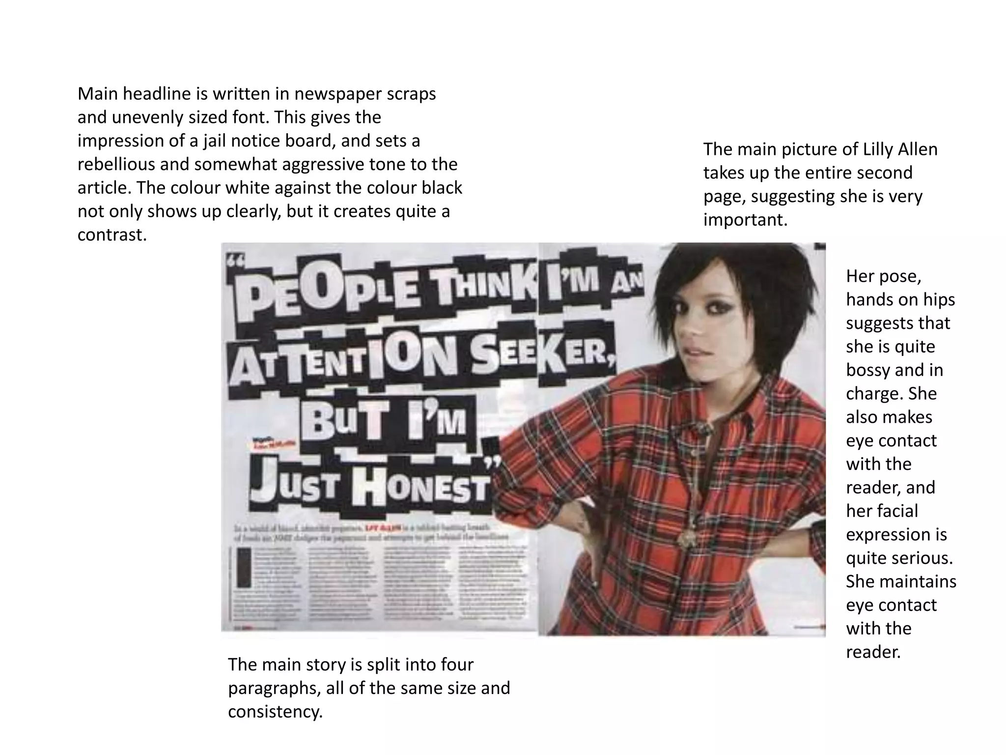 The document summarizes different sections of a magazine spread. It describes the layout and design elements used including fonts, images, placement of articles, and use of color. The main points are that the design sets a rebellious tone, contrasts black and white prominently, and splits the main story into evenly sized paragraphs. Color and images are used strategically throughout to convey meaning and engage readers.