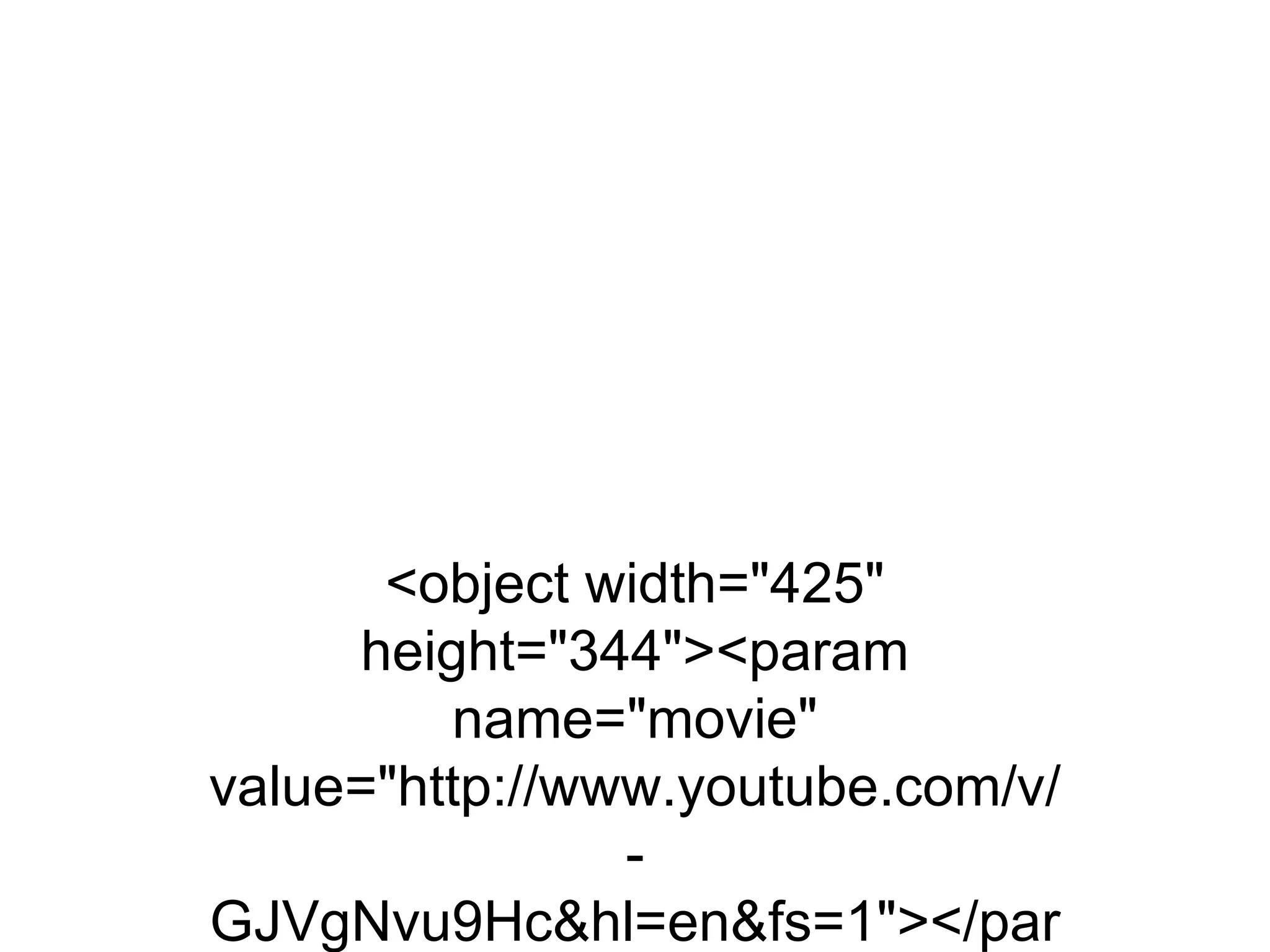 <object width="425" height="344"><paramname="movie" value="http://www.youtube.com/v/-GJVgNvu9Hc&hl=en&fs=1"></param><param name="allowFullScreen" value="true"></param><param name="allowscriptaccess" value="always"></param><embed src="http://www.youtube.com/v/-GJVgNvu9Hc&hl=en&fs=1" type="application/x-shockwave-flash" allowscriptaccess="always" allowfullscreen="true" width="425" height="344"></embed></object>