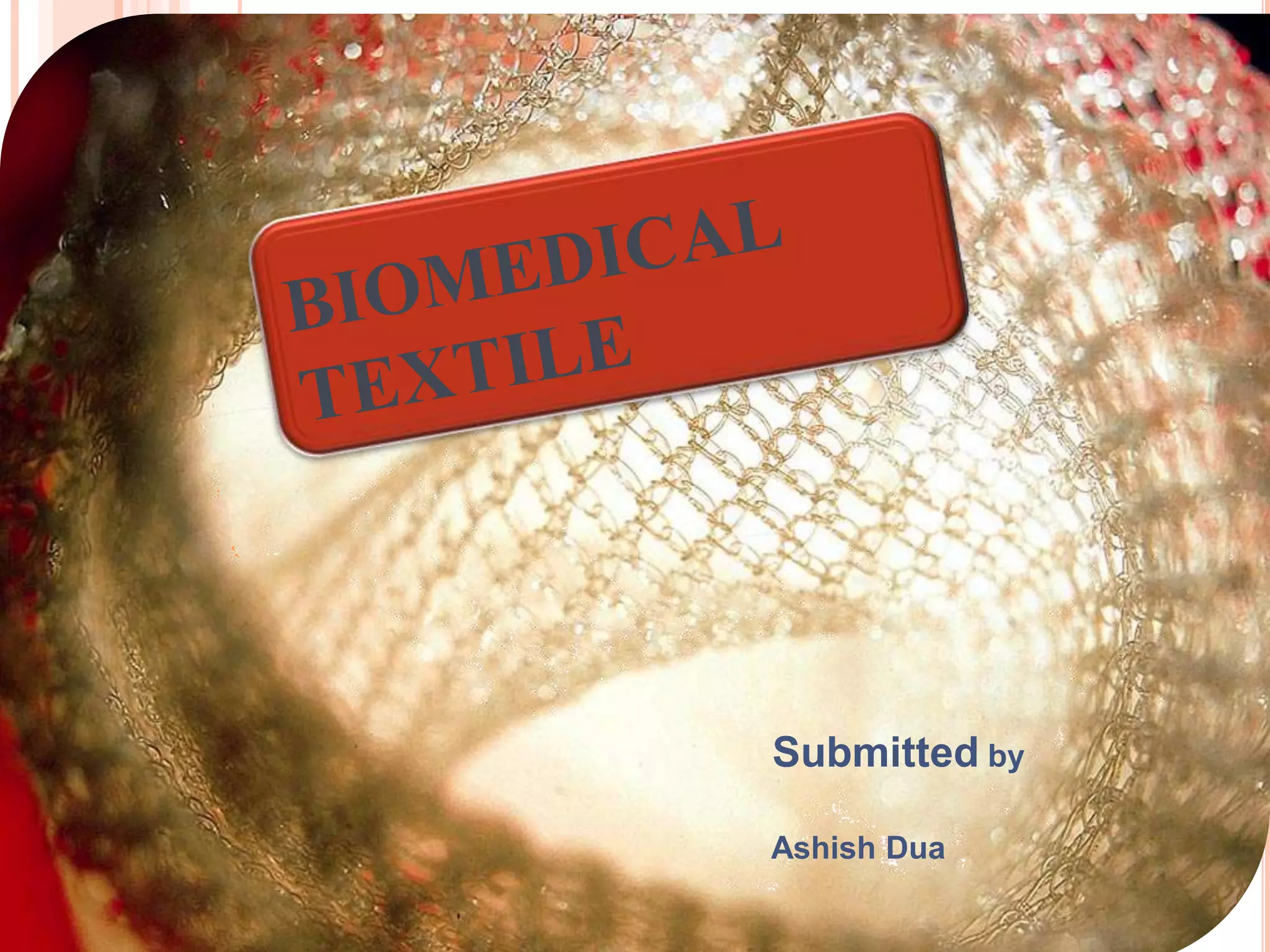 Biomedical textiles are textile products used for medical applications that come into contact with living tissue. They must be biocompatible and biostable. Medical textiles include protective clothing and wound dressings, while biomedical textiles are implantable materials used for tissue engineering and repairs. Biomedical textiles must be designed based on their intended function, biocompatibility, cost, and product approval standards. Common biocompatible polymers used include collagen, silk, PLA, PGA, and chitosan. Biomedical textiles can be classified based on their fibers and applications such as implants, scaffolds, or extracorporeal devices. Key requirements for implants include biocompatibility and appropriate porosity.