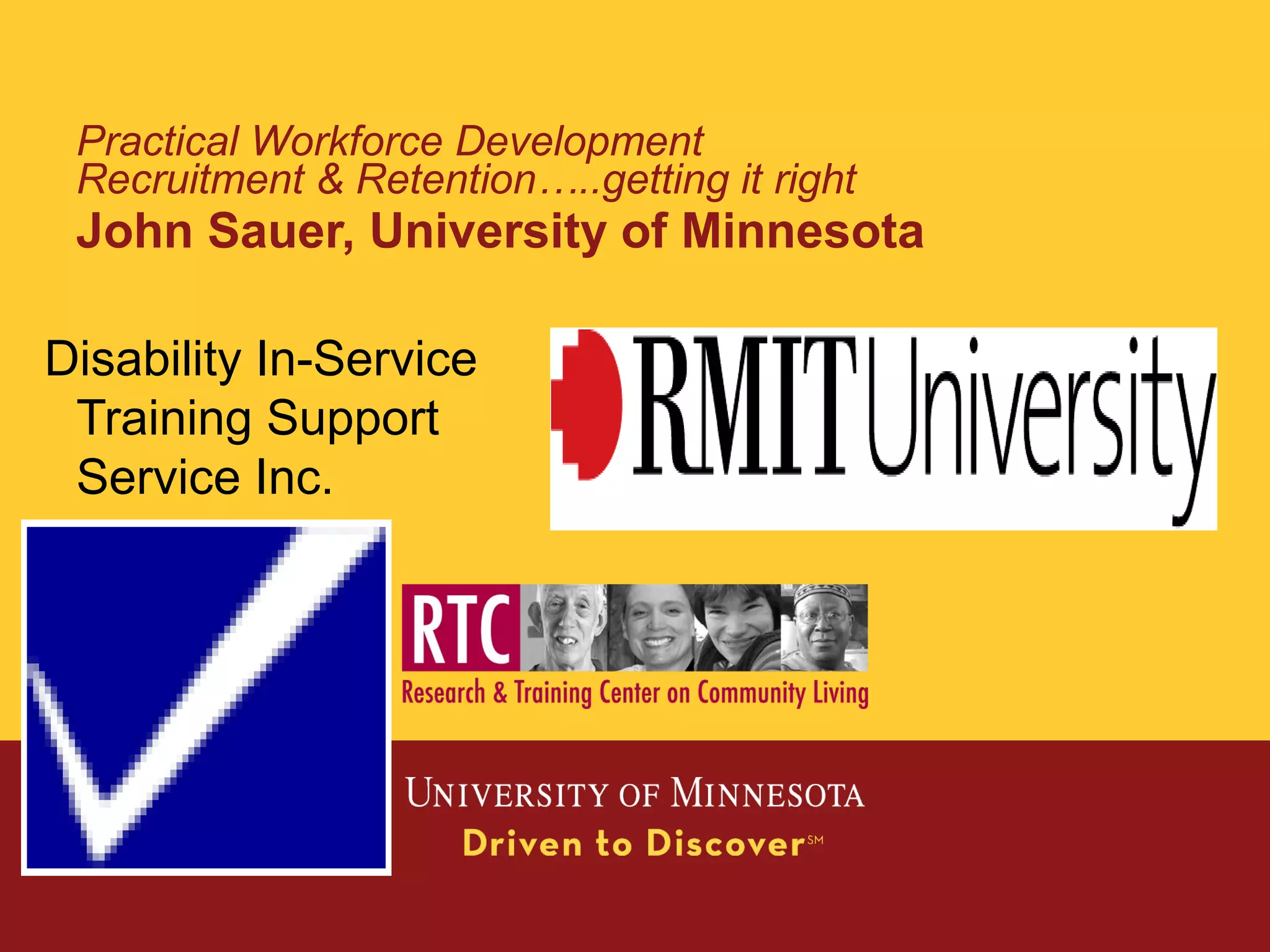 This document summarizes the results of interventions conducted as part of the National Training Institute for Frontline Supervisors and Technical Assistance Project. It found that turnover among direct support professionals reduced by an average of 18% over 2.5 years across the 5 participating state organizations and 8 other organizations. It also provides examples of effective recruitment, selection, and retention strategies used by high performing organizations, such as targeted marketing, structured interviewing, and realistic job previews. Specific initiatives undertaken in Kentucky called SPEAK are also summarized, showing reductions in turnover rates between 2004-2006 for the organization that implemented the strategies.
