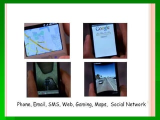 Android is an open-source operating system developed by Google and the Open Handset Alliance. It was created to provide a full software stack for mobile devices including an OS, middleware and key apps. The Android architecture includes applications, framework, libraries and services built on a Linux kernel. Developers use Java to write Android apps which run in their own process using the Dalvik virtual machine. The Android SDK provides tools like Eclipse IDE and emulators to help developers build apps for Android devices.