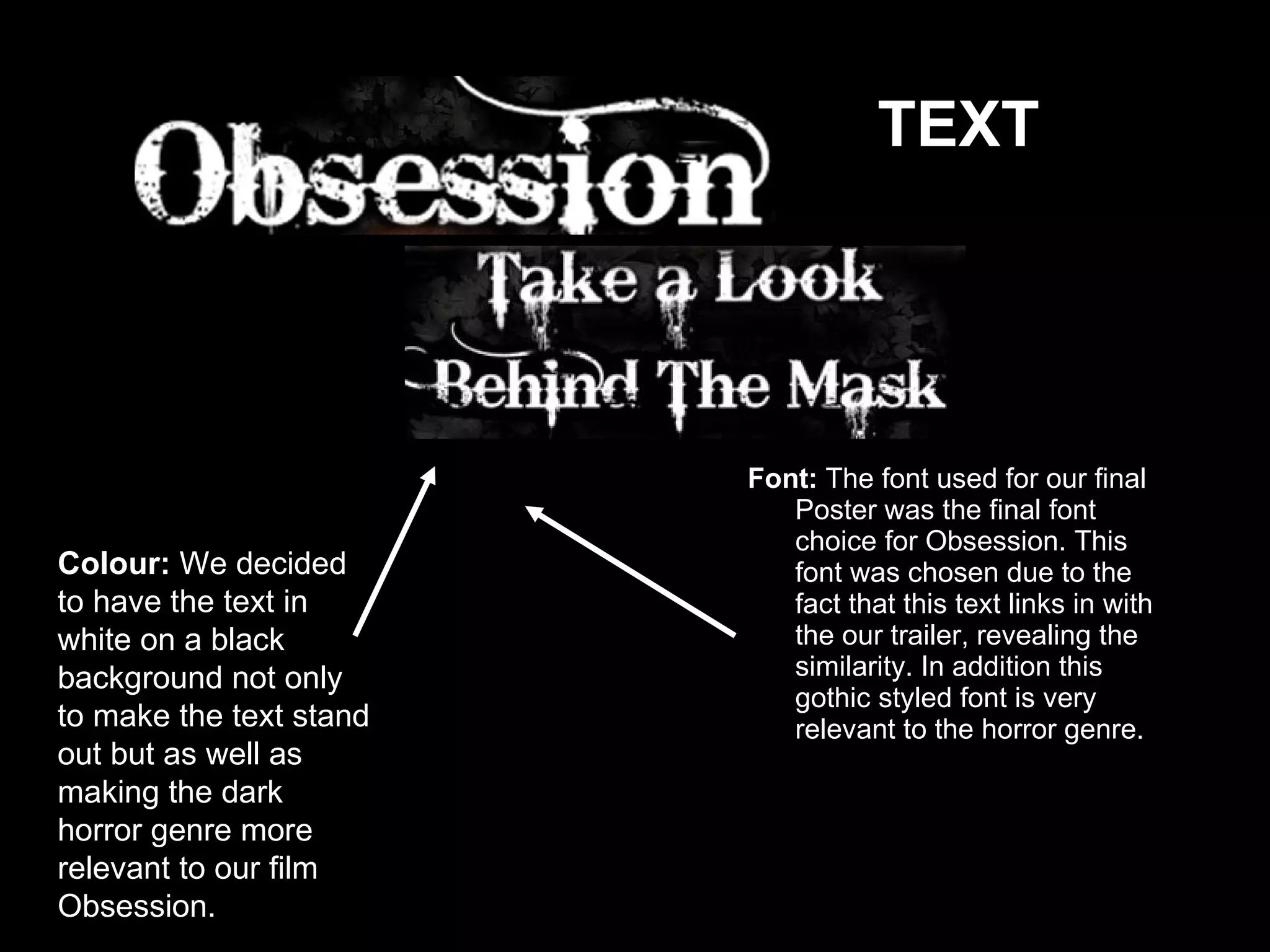 The document summarizes key design elements of a movie poster for the film "Obsession". It describes choosing a gothic font to match the trailer and horror genre. The text is written in white on a black background to make it stand out and fit the dark tone. The billing block includes standard film credits in white on black to stand out and fit the overall poster design. The main actors were chosen to portray specific roles - Samuel as an intimidating figure, Imogene with innocence, and Megan to resemble Imogene and show the obsessed character's expanding targets.