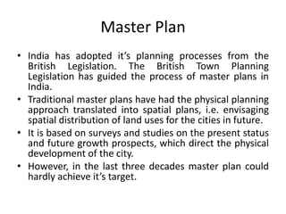 The document discusses the history and types of development plans in India. It notes that India's planning processes were adopted from British legislation, with early master plans focusing on spatial distribution of land uses. However, master plans were criticized for being ineffective due to issues like lack of funding and monitoring. The Development Plan for Bombay in 1964 was more detailed and effective but led to unplanned peripheral growth. The document outlines different types of development plans used in India, including comprehensive, zonal, regional, and local area plans, with comprehensive development plans aiming to create productive and equitable cities through consultation and infrastructure investment planning.