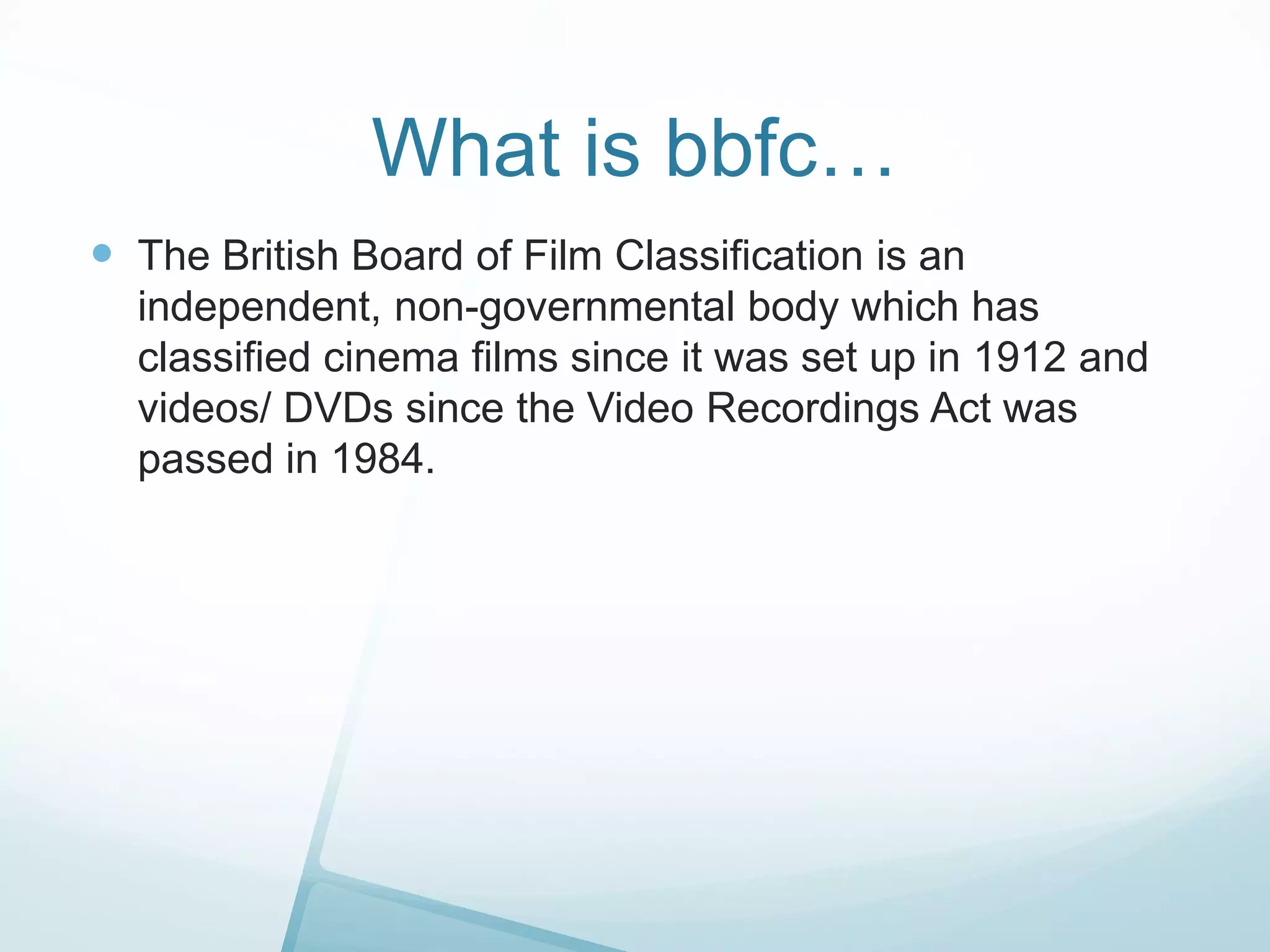 The British Board of Film Classification (BBFC) independently classifies films and videos in the UK using age ratings to help audiences decide what is appropriate for them. The document outlines the age rating system and what content is allowed at each rating level, from U for universal audiences up to 18 and R18 restricted ratings. Content involving language, sex, violence and other factors becomes progressively stronger with each older rating level.