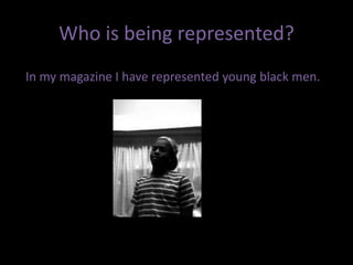 The document discusses how a media product represents young black men. It acknowledges that young black men are often stereotyped as gang members, intimidating, criminals, and drug dealers. The creator represented a young black man in their magazine in a stereotypical way by dressing him in typical clothes and giving him a threatening facial expression and body language. However, this negative representation reinforces dominant ideology by portraying a powerless group, when they could have been depicted in a more positive light as unthreatening, intelligent, and hard working.