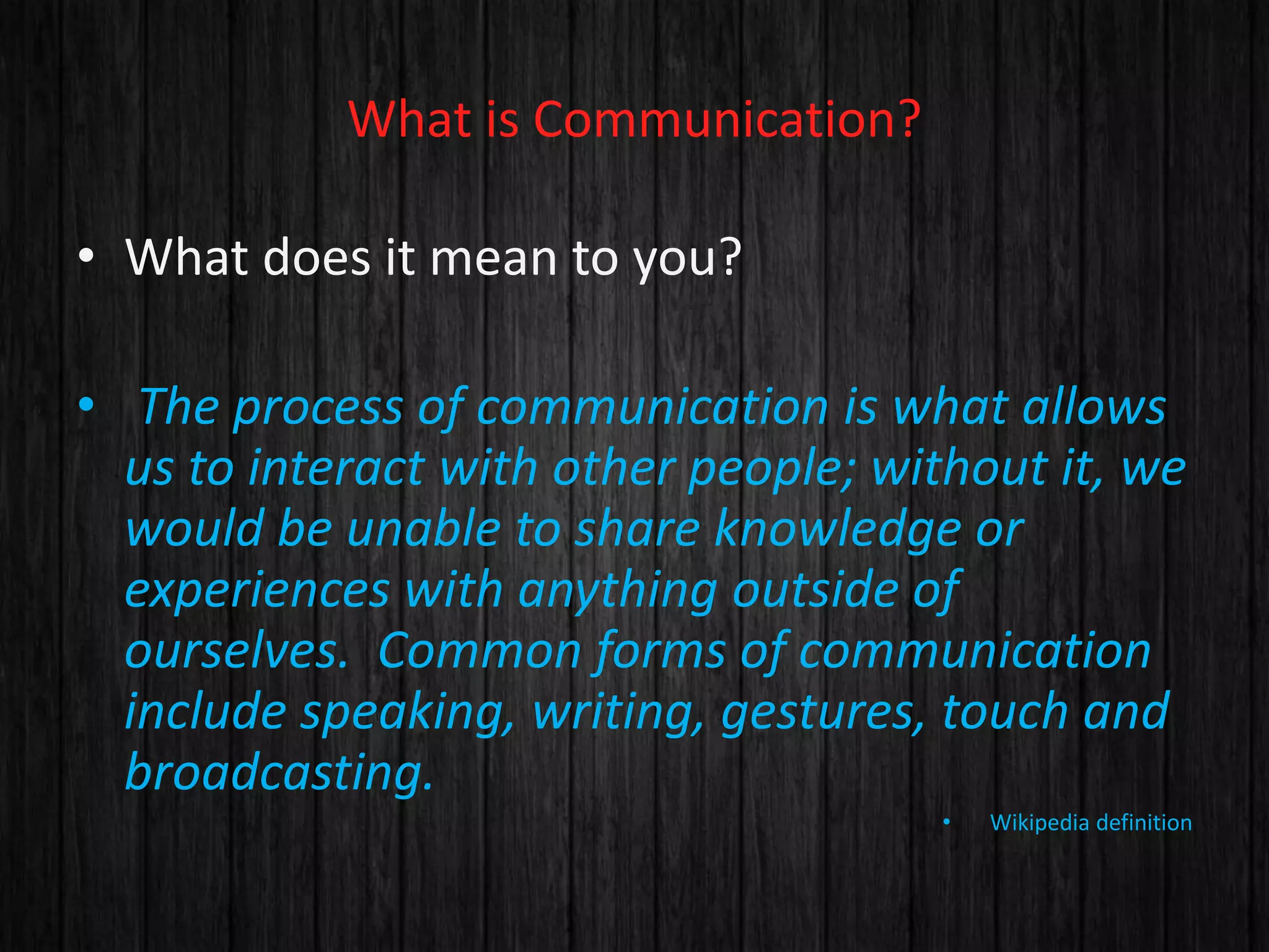 This document discusses communication and provides definitions, models, and factors that influence communication. It notes that communication allows the sharing of knowledge and experiences, and involves processes of sending and receiving messages through various channels. Key aspects that influence communication include nonverbal cues like tone of voice, body language, and facial expressions which account for 50% of the message, while words only account for 10%. The document also outlines barriers to effective communication such as language differences, noise, distractions, and lack of interest.