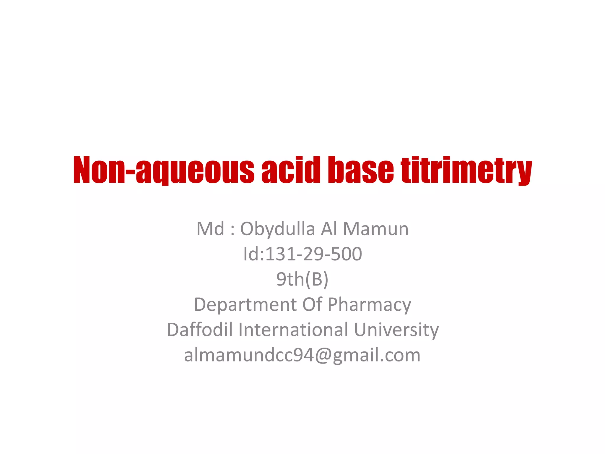 Non-aqueous acid-base titrimetry involves titrating weakly acidic or basic substances in non-aqueous solvents to achieve sharp endpoints, addressing solubility and interaction issues seen in aqueous titrations. Various types of non-aqueous solvents are used, including protophilic and protogenic, with specific indicators and titrants tailored for weak acids and bases. Advantages include better solubility for organic acids/bases and selectivity in titration, while disadvantages encompass costs and environmental concerns.