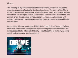 The document discusses the genre and style influences for the opening of a film. Specifically: