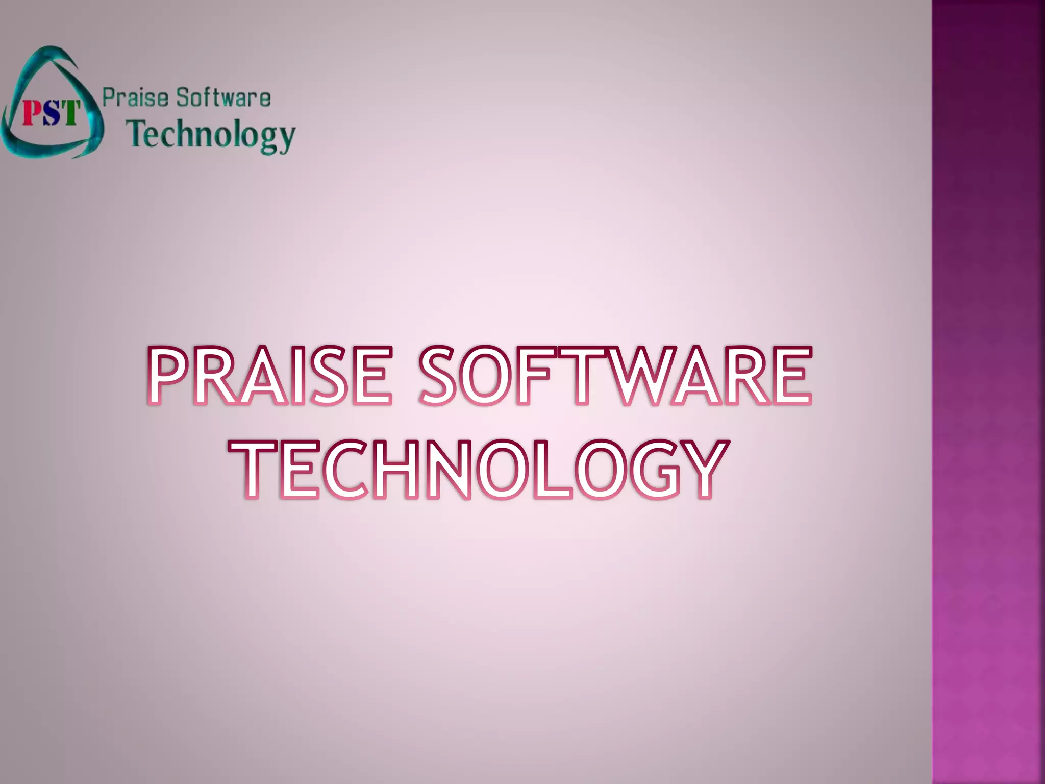 Praise Software Technology is a software development company that provides training and projects. It was established in 2014 with a vision to be a world-class training provider and a mission to provide students with opportunities. The management team believes in teamwork. The company offers training delivered by IT professionals to enhance employability skills through hands-on projects. Trainees work on live projects and are exposed to international work. The training platform includes courses in web development, programming languages, and internet marketing. Praise Software Technology provides an alternative to traditional institutes by focusing on practical skills through real-world projects.