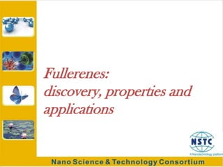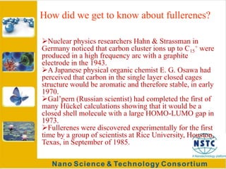 Fullerenes were discovered in 1985 at Rice University and consist of closed hollow cages of carbon atoms arranged in pentagonal and hexagonal rings. The most common fullerene is buckyball (C60), but others include C70, C72, etc. Fullerenes can be produced by vaporizing carbon in a gas medium and spontaneously forming in the condensing vapor. They are very stable due to their structure, with the highest tensile strength of any known material. Research shows fullerenes have applications as strong, resilient materials for armor and inhibiting HIV viruses due to antiviral properties when bonded to other elements.