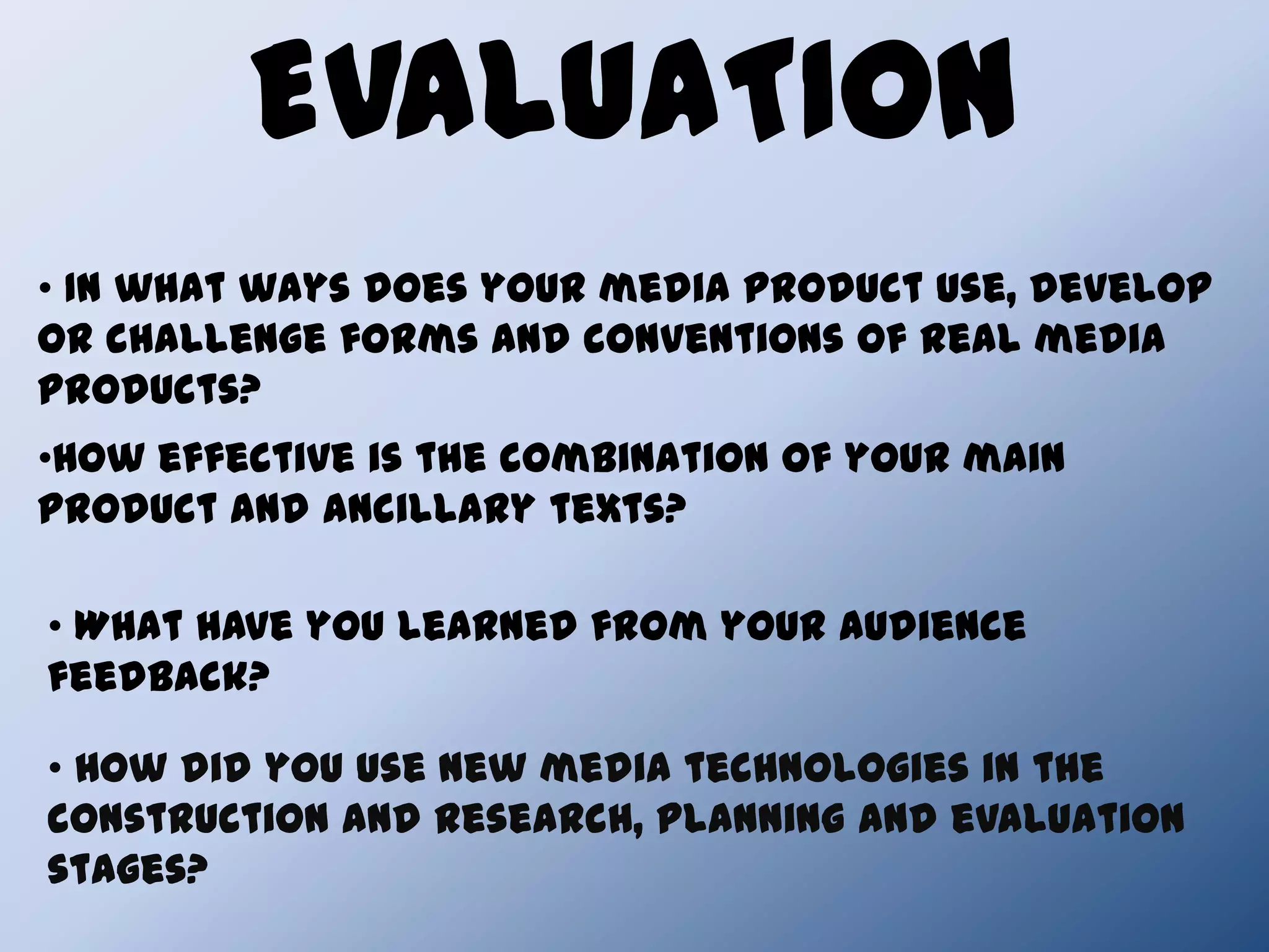The document discusses the evaluation of a media product including a music album, advertisement, and music video that tell a trilogy story. It summarizes how the products use conventions of real media, how effective the combination is through maintaining familiarity and storytelling across formats, and learning from limited audience feedback gained through online surveys and social media. New media technologies were used in the construction, research, planning and evaluation stages.