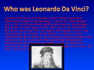 Leonardo da Vinci was a famous 15th century Italian artist born in Vinci, Italy in 1452. He is best known for paintings like the Mona Lisa and The Last Supper. Da Vinci died in 1519 leaving the Mona Lisa unfinished. The Mona Lisa is considered one of the most famous paintings in history and now hangs in the Louvre in Paris. Da Vinci was also an inventor and made early sketches of inventions like helicopters, tanks, and motor vehicles.