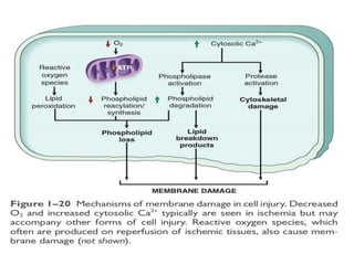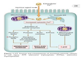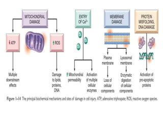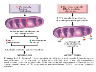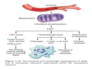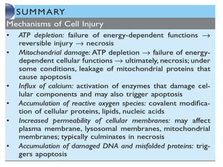 1. Depletion of ATP disrupts cellular processes and leads to necrosis as mitochondria and lysosomes are damaged. ATP depletion occurs due to reduced oxygen/nutrients, mitochondrial damage, or toxins.