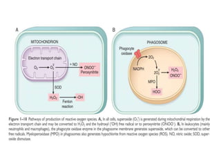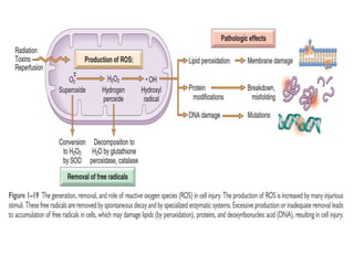 3. Accumulation of reactive oxygen species damages lipids, proteins, and DNA, causing cell injury. ROS are generated during oxidative phosphorylation and inflammation and cause oxidative stress.